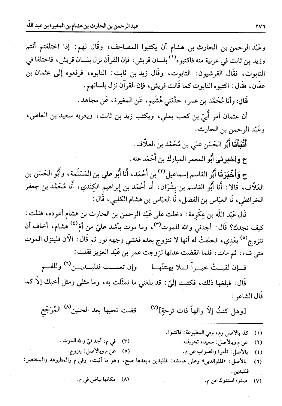 وعبد الرحمن بن الحارث بن هشام أن يكتبوا المصاحف وقال لهم إذا اختلفتم أنتم وزيد بن ثابت في عربية منه فاكتبوه (1) بلسان قريش فإن القرآن نزل بلسان قريش فاختلفا في التابوت فقال القرشيون التابوت وقال زيد بن ثابت التابوه فرفعوه إلى عثمان بن عفان فقال اكتبوه التابوت كما قالت قريش فإن القرآن نزل بلسانهم قال وأنا محمد بن عمر حدثني هشيم عن المغيرة عن مجاهد أن عثمان أمر أبي بن كعب يملي ويكتب زيد بن ثابت ويعربه سعيد بن العاص وعبد الرحمن بن الحارث أنبأنا أبو الحسن علي بن محمد بن العلاف ح وأخبرني أبو المعمر المبارك بن أحمد عنه ح وأخبرنا أبو القاسم إسماعيل (2) بن أحمد أنا أبو علي بن المسلمة وأبو الحسن بن العلاف قالا أنا أبو القاسم بن بشران أنا أحمد بن إبراهيم الكندي أنا محمد بن جعفر الخرائطي نا العباس بن الفضل نا العباس بن هشام الكلبي قال قال عبد الله بن عكرمة دخلت على عبد الرحمن بن الحارث بن هشام أعوده فقلت كيف تجدك قال أجدني والله للموت (3) وما موت بأشد علي من أم (4) هشام أخاف أن تتزوج (5) بعدي فحلفت له أنها لا تتزوج بعده فغشي وجهه نور ثم قال الآن فلينزل الموت متى شاء ثم مات فلما انقضت عدتها تزوجت عمر بن عبد العزيز فقلت * فإن لقيت خيرا فلا يهنئنها * وإن تعست فلليدين (6) وللفم * قال فبلغها ذلك فكتبت إلي قد بلغني ما تمثلت به وما مثلي ومثل أخيك إلا كما قال الشاعر * وهل كنت إلا والها ذات ترحة * (7) قضت نحبها بعد الحنين (8) المرجع