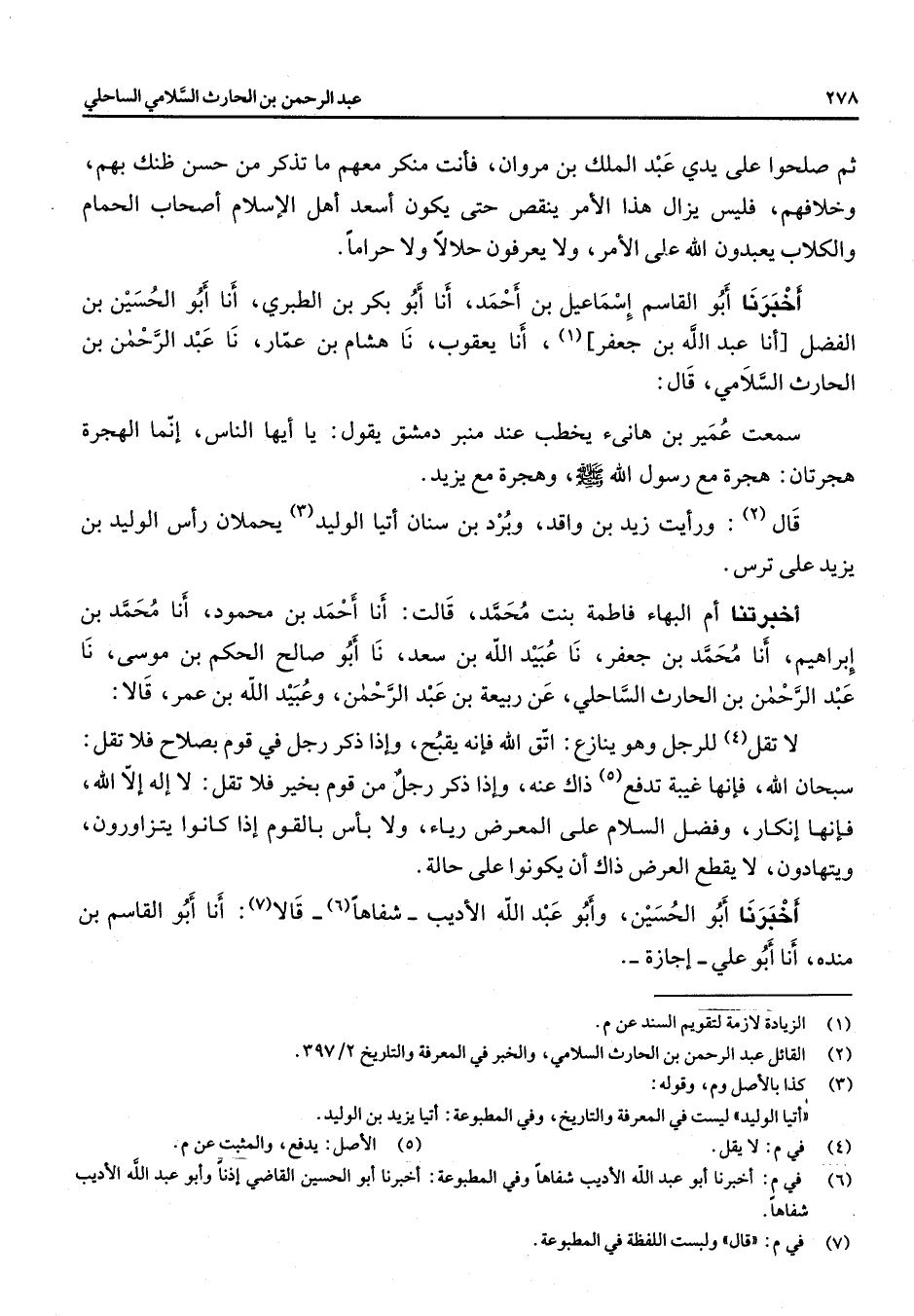 (1) الزيادة لازمة لتقويم السند عن م - (2) القائل عبد الرحمن بن الحارث السلامي والخبر في المعرفة والتاريخ 2 / 397