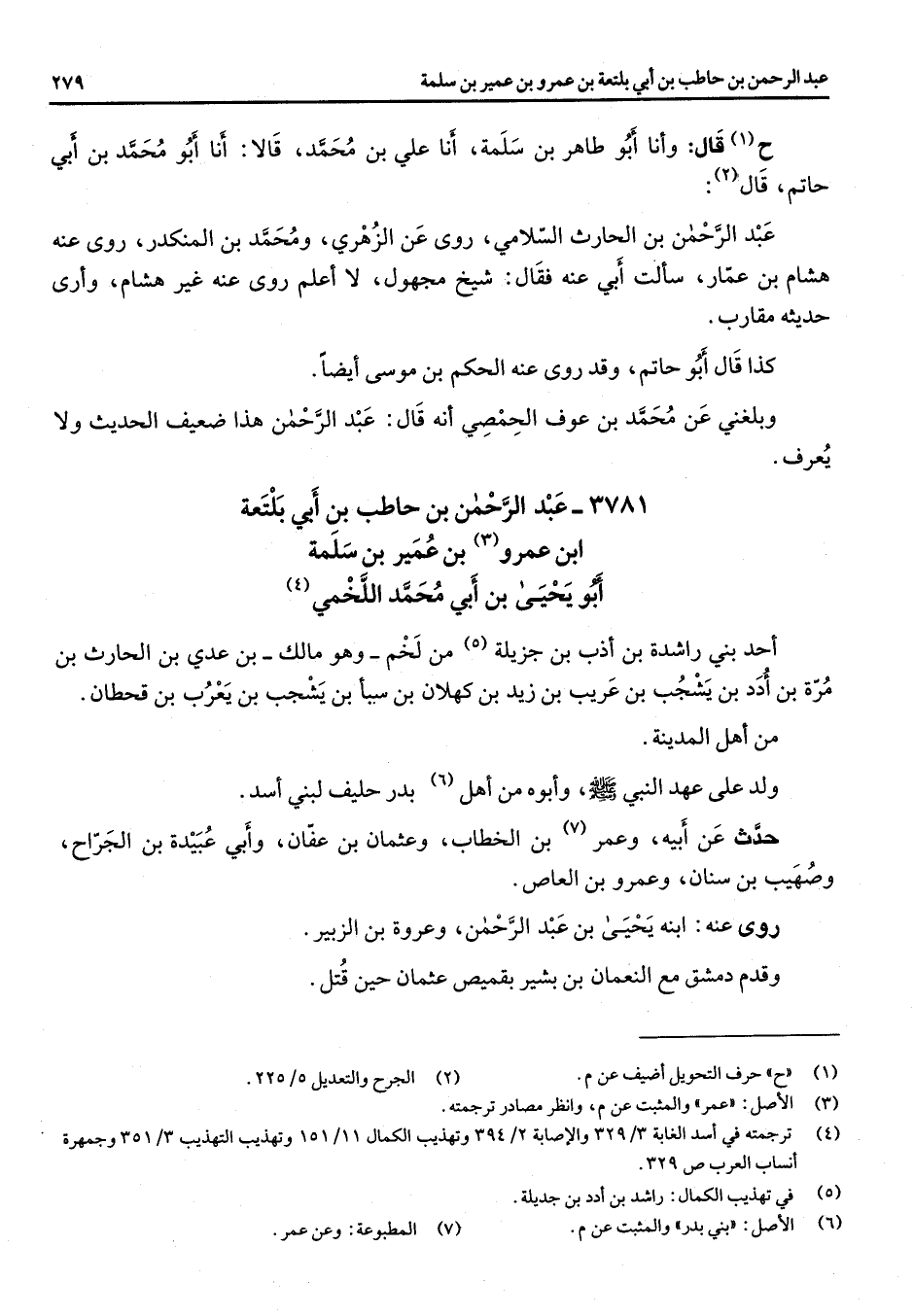 ح (1) قال وأنا أبو طاهر بن سلمة أنا علي بن محمد قالا أنا أبو محمد بن أبي حاتم قال (2) عبد الرحمن بن الحارث السلامي روى عن الزهري ومحمد بن المنكدر روى عنه هشام بن عمار سألت أبي عنه فقال شيخ مجهول لا أعلم روي عنه غير هشام وأرى حديثه مقارب كذا قال أبو حاتم وقد روى عنه الحكم بن موسى أيضا وبلغني عن محمد بن عوف الحمصي أنه قال عبد الرحمن هذا ضعيف الحديث ولا يعرف 3781 عبد الرحمن بن حاطب بن أبي بلتعة ابن عمرو (3) بن عمير بن سلمة أبو يحيى بن أبي محمد اللخمي (4) أحد بني راشدة بن أذب بن جزيلة (5) من لخم وهو مالك بن عدي بن الحارث بن مرة بن أدد بن يشجب بن عريب بن زيد بن كهلان بن سبأ بن يشجب بن يعرب بن قحطان من أهل المدينة ولد على عهد النبي (صلى الله عليه وسلم) وأبوه من أهل (6) بدر حليف لبني أسد حدث عن أبيه وعمر (7) بن الخطاب وعثمان بن عفان وأبي عبيدة بن الجراح وصهيب بن سنان وعمرو بن العاص روى عنه ابنه يحيى بن عبد الرحمن وعروة بن الزبير وقدم دمشق مع النعمان بن بشير بقميص عثمان حين قتل