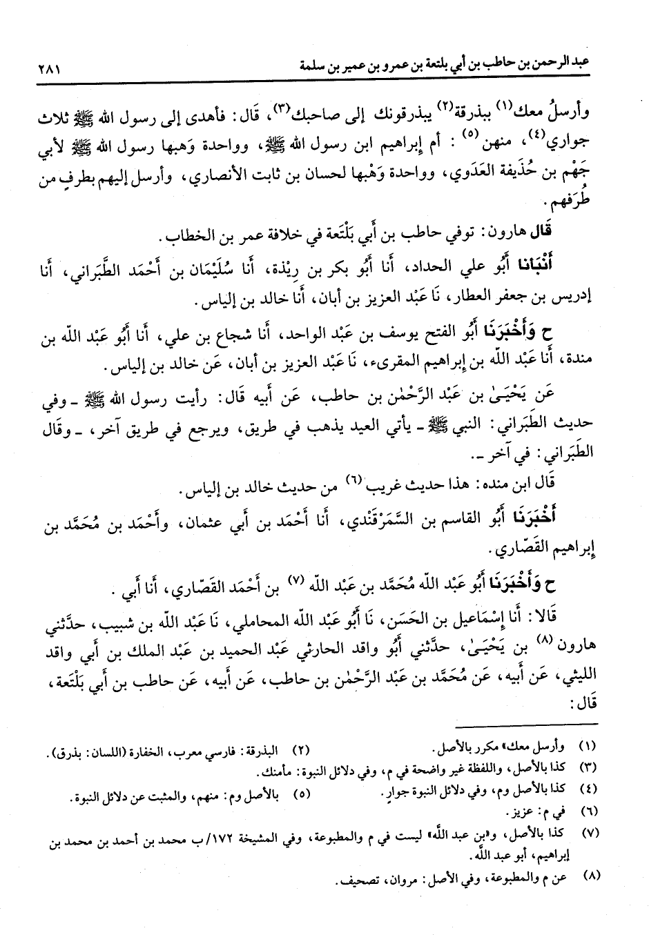 وأرسل معك (1) ببذرقة (2) يبذرقونك إلى صاحبك (3) قال فأهدى إلى رسول الله (صلى الله عليه وسلم) ثلاث جواري (4) منهن (5) أم إبراهيم ابن رسول الله (صلى الله عليه وسلم) وواحدة وهبها رسول الله (صلى الله عليه وسلم) لأبي جهم بن حذيفة العدوي وواحدة وهبها لحسان بن ثابت الأنصاري وأرسل إليهم بطرف من طرفهم قال هارون توفي حاطب بن أبي بلتعة في خلافة عمر بن الخطاب أنبأنا أبو علي الحداد أنا أبو بكر بن ريذة أنا سليمان بن أحمد الطبراني أنا إدريس بن جعفر العطار نا عبد العزيز بن أبان أنا خالد بن إلياس ح وأخبرنا أبو الفتح يوسف بن عبد الواحد أنا شجاع بن علي أنا أبو عبد الله بن مندة أنا عبد الله بن إبراهيم المقرئ نا عبد العزيز بن أبان عن خالد بن إلياس عن يحيى بن عبد الرحمن بن حاطب عن أبيه قال رأيت رسول الله (صلى الله عليه وسلم) وفي حديث الطبراني النبي (صلى الله عليه وسلم) يأتي العيد يذهب في طريق ويرجع في طريق آخر وقال الطبراني في آخر قال ابن مندة هذا حديث غريب (6) من حديث خالد بن إلياس أخبرنا أبو القاسم بن السمرقندي أنا أحمد بن أبي عثمان وأحمد بن محمد بن إبراهيم القصاري ح واخبرنا أبو عبد الله محمد بن عبد الله (7) بن أحمد القصاري أنا أبي قالا أنا إسماعيل بن الحسن نا أبو عبد الله المحاملي نا عبد الله بن شبيب حدثني هارون (8) بن يحيى حدثني أبو واقد الحارثي عبد الحميد بن عبد الملك بن أبي واقد الليثي عن أبيه عن محمد بن عبد الرحمن بن حاطب عن أبيه عن حاطب بن أبي بلتعة قال