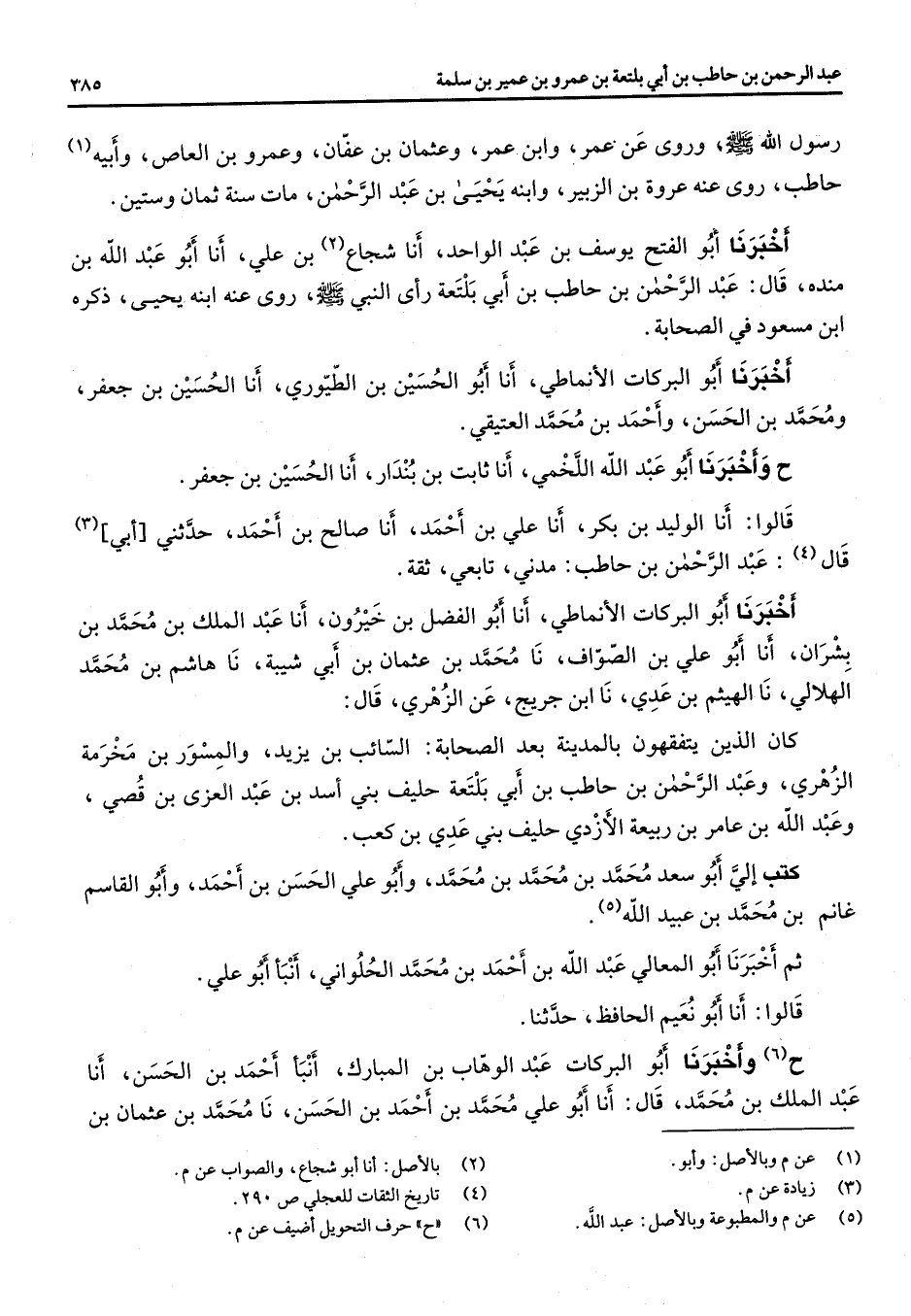 رسول الله (صلى الله عليه وسلم) وروى عن عمر وابن عمر وعثمان بن عفان وعمرو بن العاص وأبيه (1) حاطب روى عنه عروة بن الزبير وابنه يحيى بن عبد الرحمن مات سنة ثمان وستين أخبرنا أبو الفتح يوسف بن عبد الواحد أنا شجاع (2) بن علي أنا أبو عبد الله بن مندهقال عبد الرحمن بن حاطب بن أبي بلتعة رأى النبي (صلى الله عليه وسلم) روى عنه ابنه يحيى ذكره ابن مسعود في الصحابة أخبرنا أبو البركات الأنماطي أنا أبو الحسين بن الطيوري أنا الحسين بن جعفر ومحمد بن الحسن وأحمد بن محمد العتيقي ح وأخبرنا أبو عبد الله اللخمي أنا ثابت بن بندار أنا الحسين بن جعفر قالوا أنا الوليد بن بكر أنا علي بن أحمد أنا صالح بن أحمد حدثني أبي (3) قال (4) عبد الرحمن بن حاطب مدني تابعي ثقة أخبرنا أبو البركات الأنماطي أنا أبو الفضل بن خيرون أنا عبد الملك بن محمد بن بشران أنا أبو علي بن الصواف نا محمد بن عثمان بن أبي شيبة نا هاشم بن محمد الهلالي نا الهيثم بن عدي نا ابن جريج عن الزهري قال كان الذين يتفقهون بالمدينة بعد الصحابة السائب بن يزيد والمسور بن مخرمة الزهري وعبد الرحمن بن حاطب بن أبي بلتعة حليف بني أسد بن عبد العزي بن قصي وعبد الله بن عامر بن ربيعة الأزدي حليف بني عدي بن كعب كتب إلي أبو سعد محمد بن محمد بن محمد وأبو علي الحسن بن أحمد وأبو القاسم غانم بن محمد بن عبيد الله (5) ثم أخبرنا أبو المعالي عبد الله بن أحمد بن محمد الحلواني أنبأ أبو علي قالوا أنا أبو نعيم الحافظ حدثنا ح (6) وأخبرنا أبو البركات عبد الوهاب بن المبارك أنبأ أحمد بن الحسن أنا عبد الملك بن محمد قال أنا أبو علي محمد بن أحمد بن الحسن نا محمد بن عثمان بن