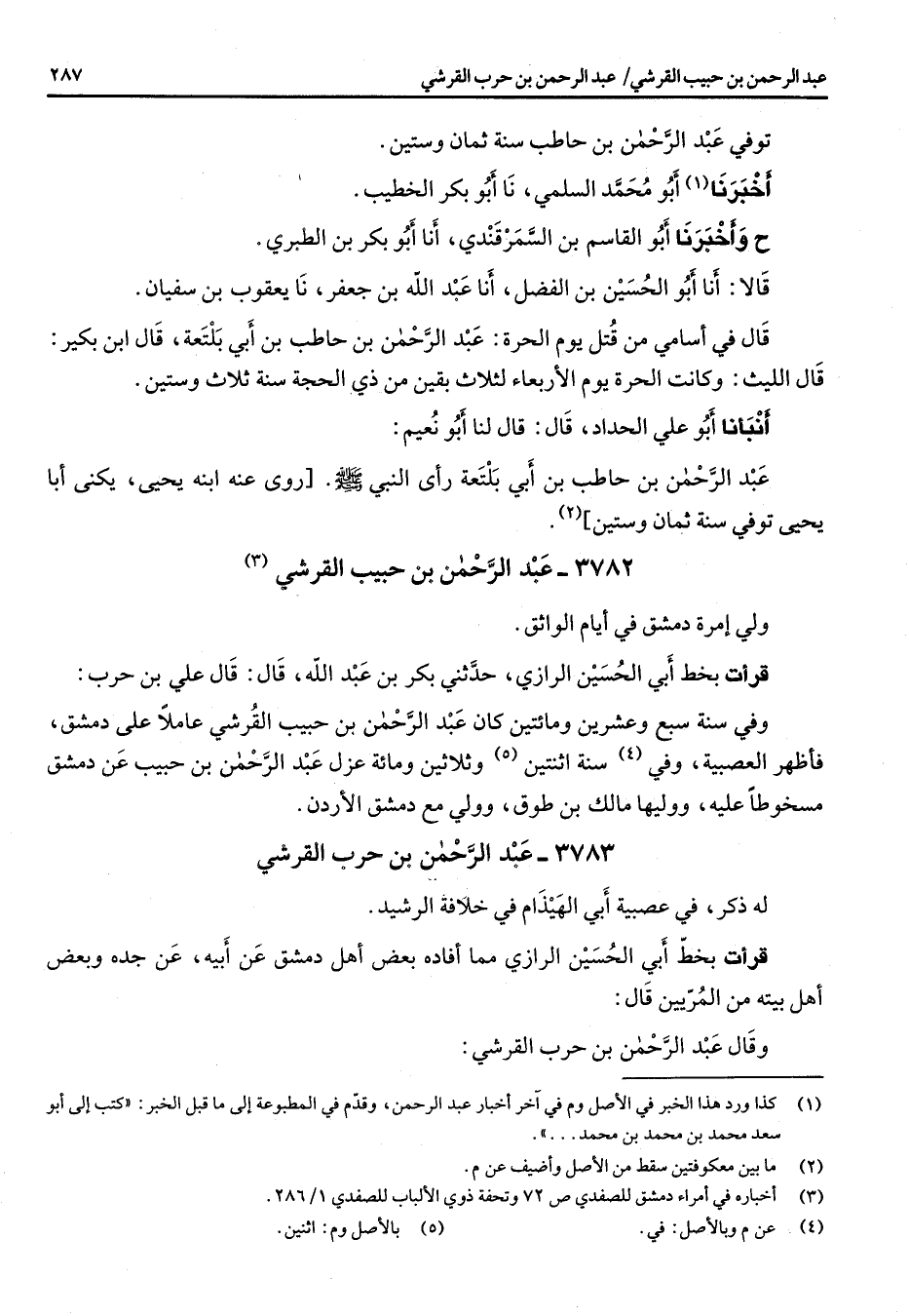 3783 - عبد الرحمن بن حرب القرشي له ذكر في عصبية أبي الهيذام في خلافة الرشيد قرأت بخط أبي الحسين الرازي مما أفاده بعض أهل دمشق عن أبيه عن جده وبعض أهل بيته من المريين قال وقال عبد الرحمن بن حرب القرشي *