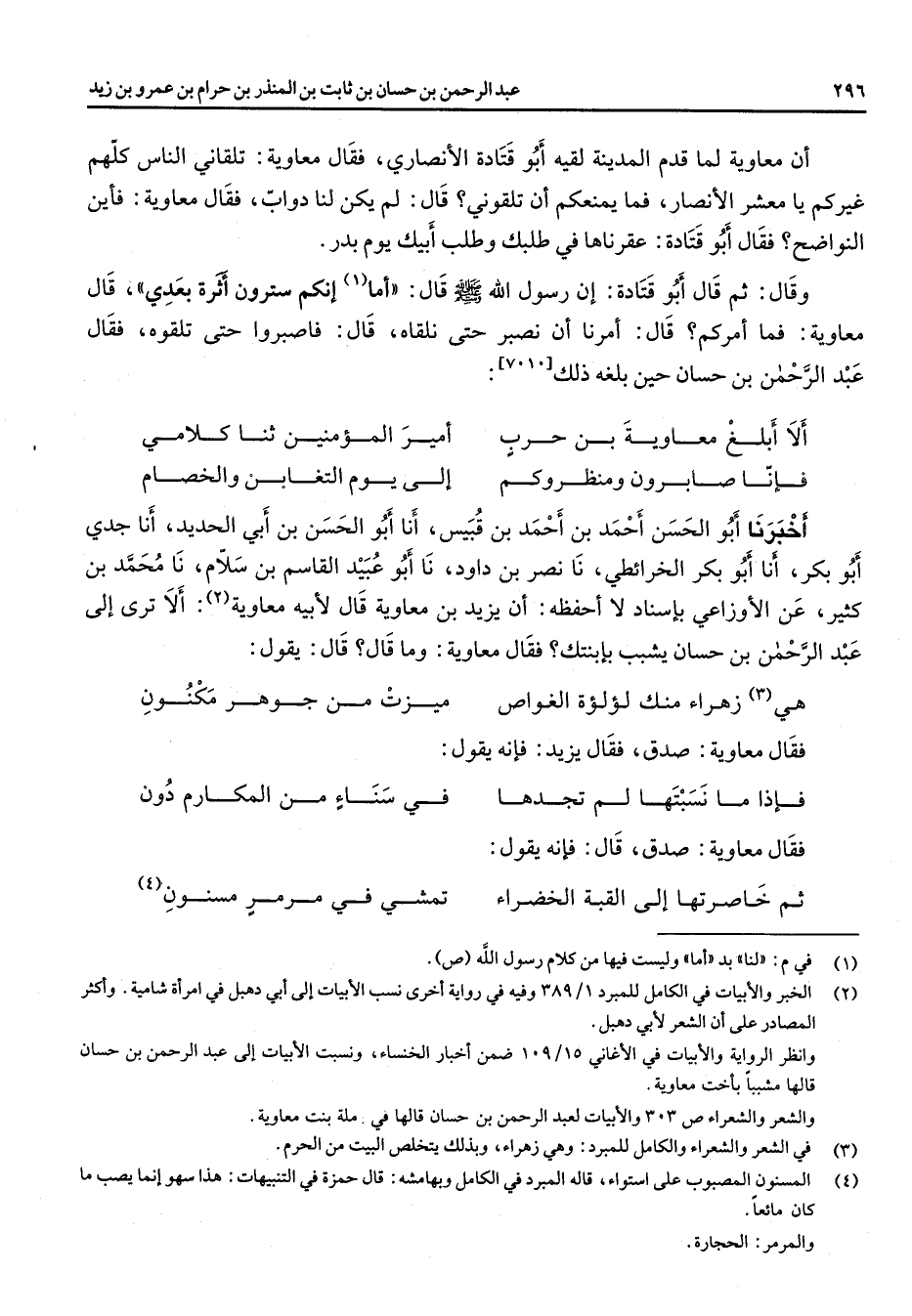 أن معاوية لما قدم المدينة لقيه أبو قتادة الأنصاري فقال معاوية تلقاني الناس كلهم غيركم يا معشر الأنصار فما يمنعكم أن تلقوني قال لم يكن لنا دواب فقال معاوية فأين النواضح فقال أبو قتادة عقرناها في طلبك وطلب أبيك يوم بدر وقال ثم قال أبو قتادة إن رسول الله (صلى الله عليه وسلم) قال أما (1) إنكم سترون أثره بعدي قال معاوية فما أمركم قال أمرنا أن نصبر حتى نلقاه قال فاصبروا حتى تلقوه فقال عبد الرحمن بن حسان حين بلغه ذلك