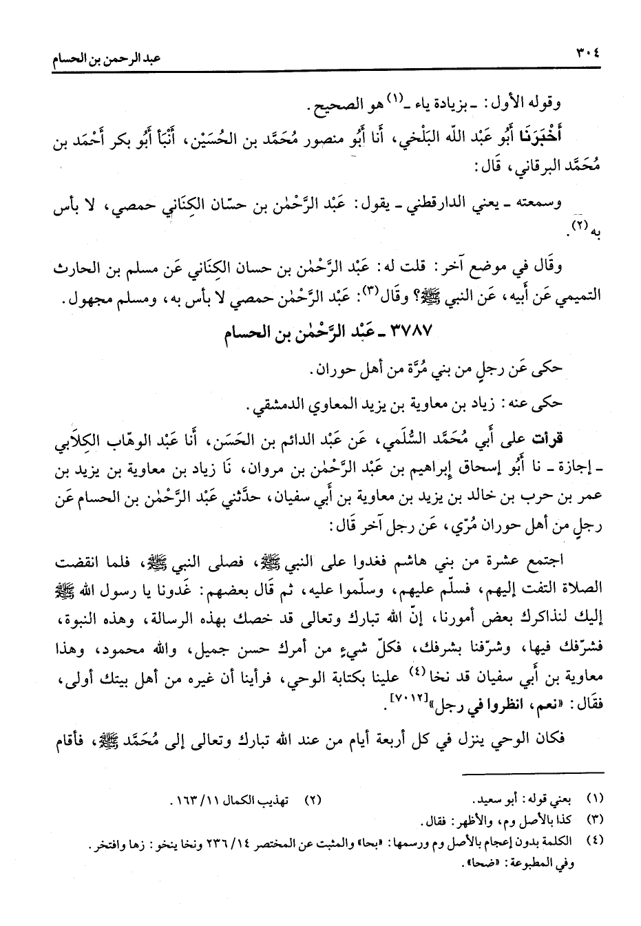3787 - عبد الرحمن بن الحسام حكى عن رجل من بني مرة من أهل حوران حكى عنه زياد بن معاوية بن يزيد المعاوي الدمشقي قرأت على أبي محمد السلمي عن عبد الدائم بن الحسن أنا عبد الوهاب الكلابي إجازة نا أبو إسحاق إبراهيم بن عبد الرحمن بن مروان نا زياد بن معاوية بن يزيد بن عمر بن حرب بن خالد بن يزيد بن معاوية بن أبي سفيان حدثني عبد الرحمن بن الحسام عن رجل من أهل حوران مري عن رجل آخر قال اجتمع عشرة من بني هاشم فغدوا على النبي (صلى الله عليه وسلم) فصلى النبي (صلى الله عليه وسلم) فلما انقضت الصلاة التفت إليهم فسلم عليهم وسلموا عليه ثم قال بعضهم غدونا يا رسول الله (صلى الله عليه وسلم) إليك لنذاكرك بعض أمورنا إن الله تبارك وتعالى قد خصك بهذه الرسالة وهذه النبوة فشرفك فيها وشرفنا يشرفك فكل شئ من أمرك حسن جميل والله محمود وهذا معاوية بن أبي سفيان قد نخا (4) علينا بكتابة الوحي فرأينا أن غيره من أهل بيتك أولى فقال نعم انظروا في رجل