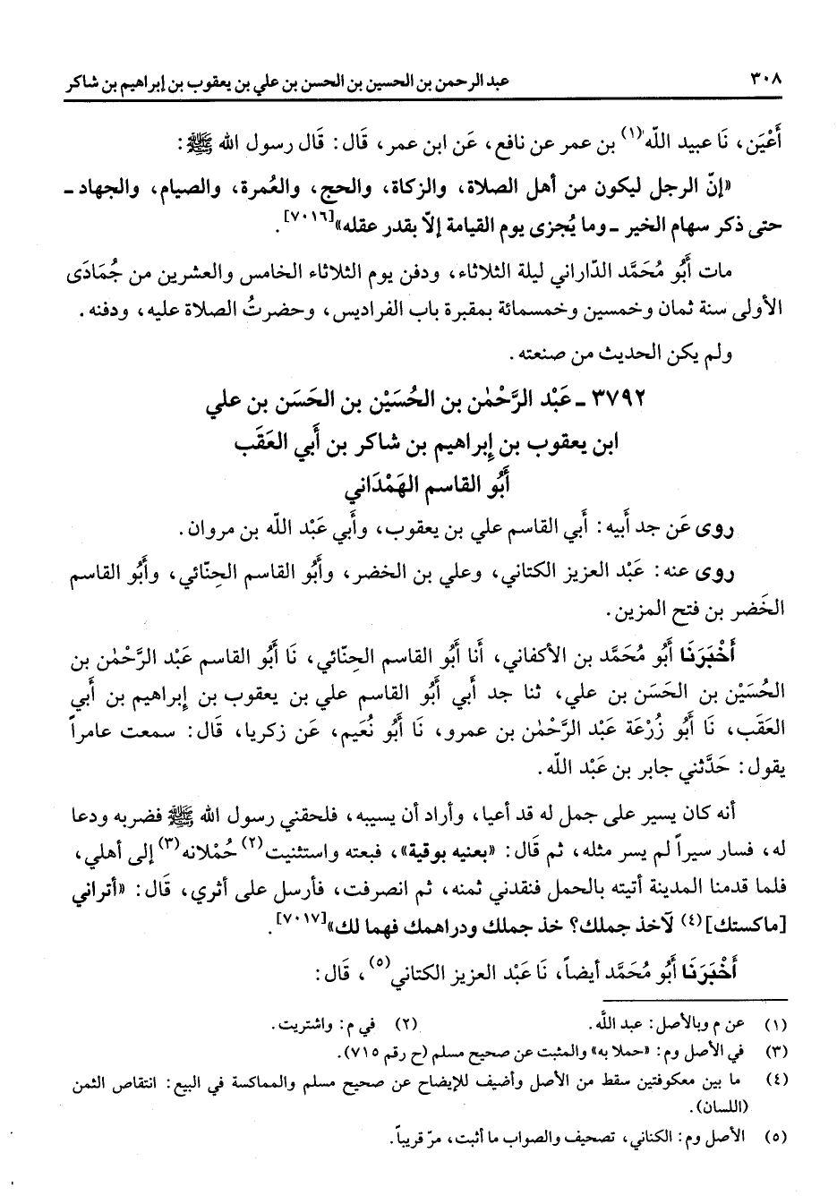 3792 - عبد الرحمن بن الحسين بن الحسن بن علي ابن يعقوب بن إبراهيم بن شاكر بن أبي العقب أبو القاسم الهمداني روى عن جد أبيه أبي القاسم علي بن يعقوب وأبي عبد الله بن مروان روى عنه عبد العزيز الكتاني وعلي بن الخضر وأبو القاسم الحنائي وأبو القاسم الخضر بن فتح المزين أخبرنا أبو محمد بن الأكفاني أنا أبو القاسم الحنائي نا أبو القاسم عبد الرحمن بن الحسين بن الحسن بن علي ثنا جد أبي أبو القاسم علي بن يعقوب بن إبراهيم بن أبي العقب نا أبو زرعة عبد الرحمن بن عمرو نا أبو نعيم عن زكريا قال سمعت عامرا يقول حدثني جابر بن عبد الله أنه كان يسير على جمل له قد أعيا وأراد أن يسيبه فلحقني رسول الله (صلى الله عليه وسلم) فضربه ودعا له فسار سيرا لم يسر مثله ثم قال بعنيه بوقية فبعته واستثنيت (2) حملانه (3) إلى أهلي فلما قدمنا المدينة أتيته بالحمل فنقدني ثمنه ثم انصرفت فأرسل على أثري قال أتراني ماكستك (4) لآخذ جملك خذ جملك ودراهمك فهما لك