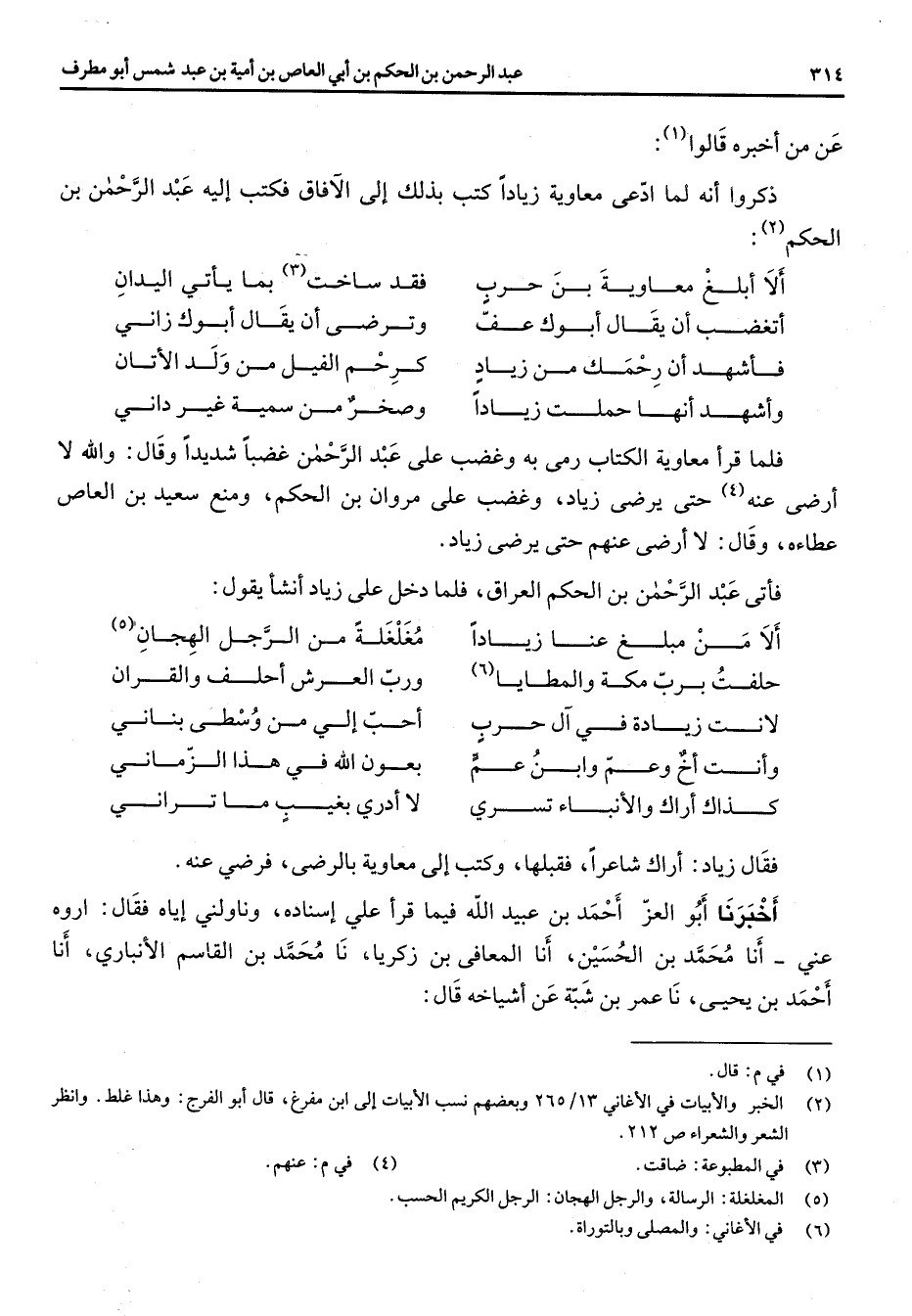 عن من أخبره قالوا (1) ذكروا أنه لما ادعى معاوية زيادا كتب بذلك إلى الآفاق فكتب إليه عبد الرحمن بن الحكم (2) * ألا أبلغ معاوية بن حرب * فقد ساخت (3) بما يأتي اليدان أتغضب أن يقال أبوك عف * وترضى أن يقال أبوك زاني فأشهد أن رحمك مزياد * كرحم الفيل من ولد الأتان وأشهد أنها حملت زيادا * وصخر من سمية غير داني * فلما قرأ معاوية الكتاب رمى به وغضب على عبد الرحمن غضبا شديدا وقال والله لا أرضى عنه (4) حتى يرضى زياد وغضب على مروان بن الحكم ومنع سعيد بن العاص عطاءه وقال لا أرضى عنهم حتى يرضى زياد فأتى عبد الرحمن بن الحكم العراق فلما دخل على زياد أنشأ يقول * ألا من مبلغ عنا زيادا * مغلغلة من الرجل الهجان (5) حلفت برب مكة والمطايا (6) * ورب العرش أحلف والقران لانت زيادة في آل حرب * أحب إلي من وسطي بناني وأنت أخ وعم وابن عم * بعون الله في هذا الزماني كذاك أراك والأنباء تسري * لا أدري بغيب ما تراني * فقال زياد أراك شاعرا فقبلها وكتب إلى معاوية بالرضى فرضي عنه أخبرنا أبو العز أحمد بن عبيد الله فيما قرأ علي إسناده وناولني إياه فقال اروه عني أنا محمد بن الحسين أنا المعافى بن زكريا نا محمد بن القاسم الأنباري أنا أحمد بن يحيى نا عمر بن شبة عن أشياخه قال