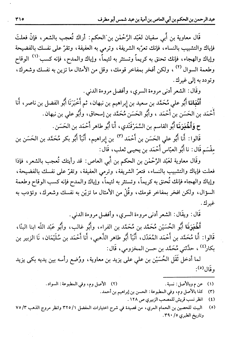قال معاوية بن أبي سفيان لعبد الرحمن بن الحكم أراك تعجب بالشعر فإن فعلت فإياك والتشبيب بالنساء فإنك تعربه الشريفة وترمي به العفيفة وتقر على نفسك بالفضيحة وإياك والهجاء فإنك تحنق به كريما وتستثر به لئيما وإياك والمدح فإنه كسب (1) الوقاح وطعمه السوال (2) ولكن أفخر بمفاخر قومك وقل من الأمثال ما تزين به نفسك وشعرك وتودد به إلى غيرك وقال الشعر أدنى مروءة السري وأفضل مروءة الدني أنبأنا أبو علي محمد بن سعيد بن إبراهيم بن نبهان ثم أخبرنا أبو الفضل بن ناصر أنا أحمد بن الحسن بن أحمد وأبو الحسن محمد بن إسحاق وأبو علي بن نبهان ح وأخبرنا أبو القاسم بن السمرقندي أنا أبو طاهر أحمد بن الحسن قالوا أنا أبو علي الحسن بن أحمد (3) بن إبراهيم أنبأ أبو بكر محمد بن الحسن بن مقسم قال نا أبو العباس أحمد بن يحيى ثعلب قال وقال معاوية لعبد الرحمن بن الحكم بن أبي العاص قد رأيتك تعجب بالشعر فإذا فعلت فإياك والتشبيب بالنساء فتعر الشريفة وترمي العفيفة وتقر على نفسك بالفضيحة وإياك والهجاء فإنك تحنق به كريما وتستثر به لئيما وإياك والمدح فإنه كسب الوقاح وطعمه السؤال ولكن افخر بمفاخر قومك وقل من الأمثال ما تزين به نفسك وشعرك وتؤدب به غيرك قال ويقال الشعر أدنى مروءة السري وأفضل مروءة الدني أخبرنا أبو الحسين محمد بن محمد بن الفراء وأبو غالب وأبو عبد الله ابنا البنا قالوا أنا محمد بن أحمد المعدل أنبأ أبو طاهر الذهبي أنا أحمد بن سليمان نا الزبير بن بكار (4) حدثني محمد بن حسن المخزومي قال لما ادخل ثقل الحسين بن علي على يزيد بن معاوية ووضع رأسه بين يديه بكي يزيد وقال (5)