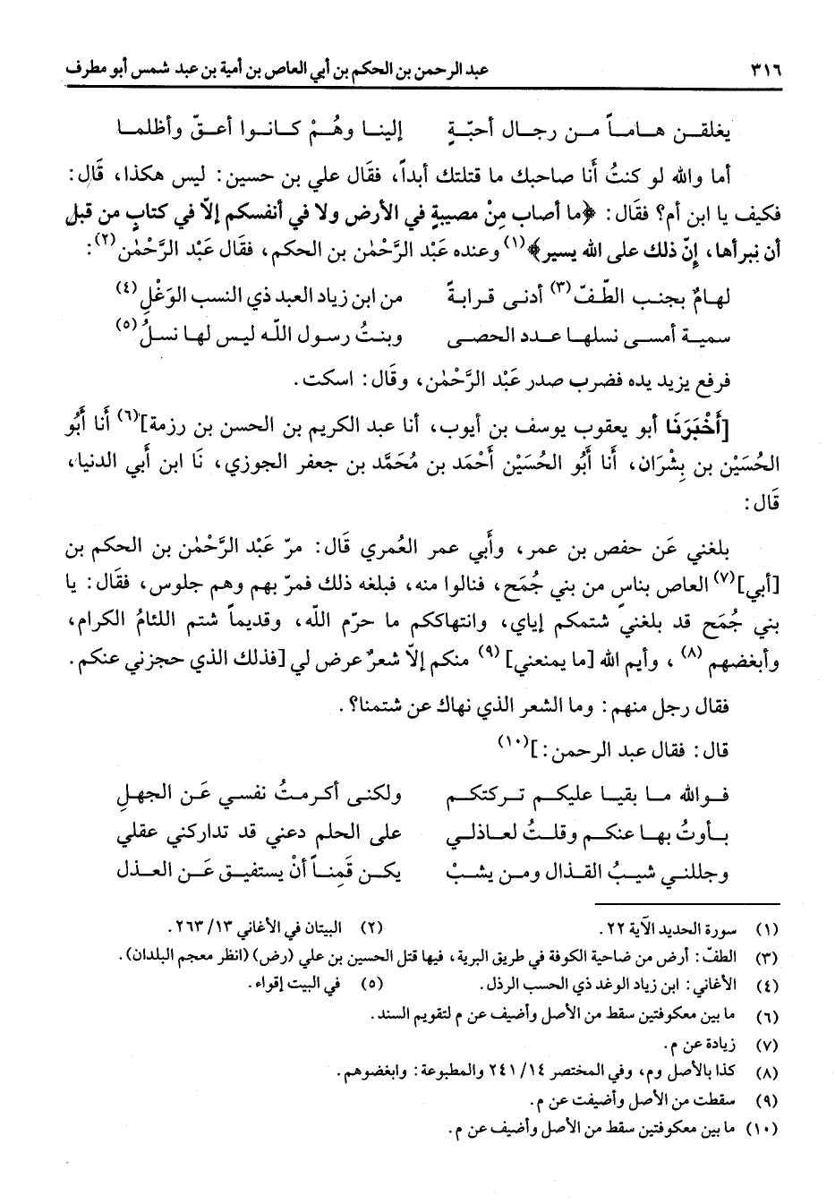* يغلقن هاما من رجال أحبة * إلينا وهم كانوا أعق وأظلما أما والله لو كنت أنا صاحبك ما قتلتك أبدا فقال علي بن حسين ليس هكذا قال فكيف يا ابن أم فقال " ما أصاب من مصيبة في الأرض ولا في أنفسكم إلا في كتاب من قبل أن نبرأها إن ذلك على الله يسير " (1) وعنده عبد الرحمن بن الحكم فقال عبد الرحمن (2) * لهام بجنب الطف (3) أدنى قرابة * من ابن زياد العبد ذي النسب الوغل (4) سمية أمسى نسلها عدد الحصى * وبنت رسول الله ليس لها نسل * (5) فرفع يزيد يده فضرب صدر عبد الرحمن وقال اسكت أخبرنا أبو يعقوب يوسف بن أيوب أنا عبد الكريم بن الحسن بن رزمة (6) أنا