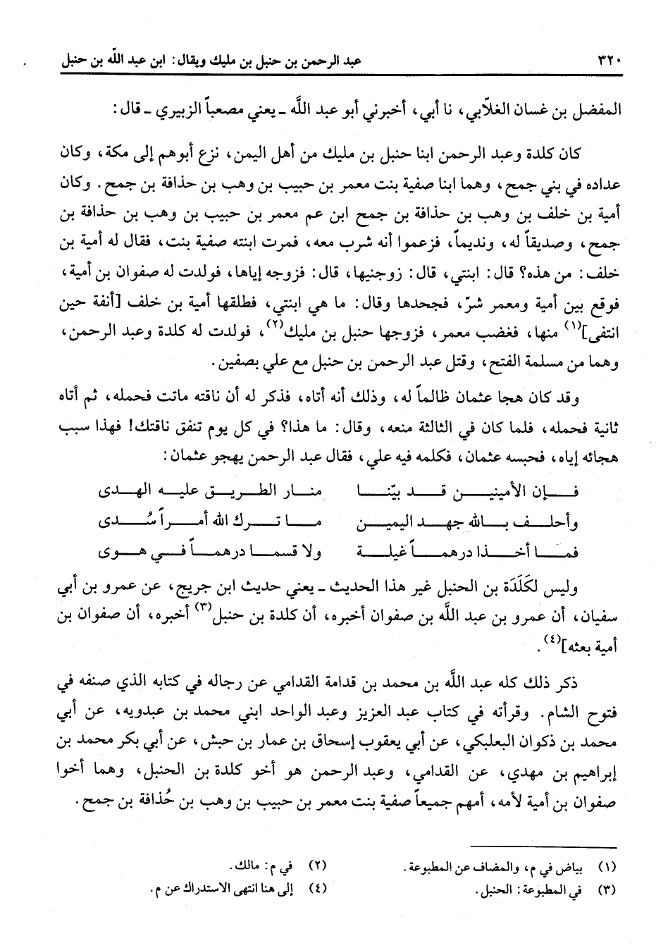 المفضل بن غسان الغلابي نا أبي أخبرني أبو عبد الله يعني مصعبا الزبيري قال كان كلدة وعبد الرحمن ابنا حنبل بن مليك من أهل اليمن نزع أبوهم إلى مكة وكان عداده في بني جمح وهما ابنا صفية بنت معمر بن حبيب بن وهب بن حذافة بن جمح وكان أمية بن خلف بن وهب بن حذافة بن جمح ابن عم معمر بن حبيب بن وهب بن حذافة بن جمح وصديقا له ونديما فزعموا أنه شرب معه فمرت ابنته صفية بنت فقال له أمية بن خلف من هذه قال ابنتي قال زوجنيها قال فزوجه إياها فولدت له صفوان بن أمية فوقع بين أمية ومعمر شر فجحدها وقال ما هي ابنتي فطلقها أمية بن خلف أنفه حين انتفى (1) منها فغضب معمر فزوجها حنبل بن مليك (2) فولدت له كلدة وعبد الرحمن وهما من مسلمة الفتح وقتل عبد الرحمن بن حنبل مع علي بصفين وقد كان هجا عثمان ظالما له وذلك أنه أتاه فذكر له أن ناقته ماتت فحمله ثم أتاه ثانية فحمله فلما كان في الثالثة منعه وقال ما هذا في كل يوم تنفق ناقتك فهذا سبب هجائه إياه فحبسه عثمان فكلمه فيه علي فقال عبد الرحمن يهجو عثمان * فإن الأمينين قد بينا * منار الطريق عليه الهدى وأحلف بالله جهد اليمين * ما ترك الله أمرا سدى فما أخذا درهما غيلة * ولا قسما درهما في هوى * وليس لكلدة بن الحنبل غير هذا الحديث يعني حديث ابن جريج عن عمرو بن أبي سفيان أن عمرو بن عبد الله بن صفوان أخبره أن كلدة بن حنبل (3) أخبره أن صفوان بن أمية بعثه (4) ذكر ذلك كله عبد الله بن محمد بن قدامة القدامي عن رجاله في كتابه الذي صنفه في فتوح الشام وقرأته في كتاب عبد العزيز وعبد الواحد ابني محمد بن عبدوية عن أبي محمد بن ذكوان البعلبكي عن أبي يعقوب إسحاق بن عمار بن حبش عن أبي بكر محمد بن إبراهيم بن مهدي عن القدامي وعبد الرحمن عو أخو كلدة بن الحنبل وهما أخوا صفوان بن أمية لأمه أمهم جميعا صفية بنت معمر بن حبيب بن وهب بن حذافة بن جمح