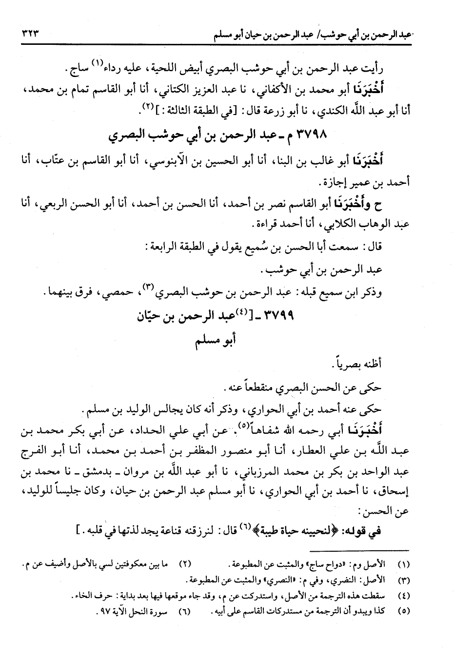 رأيت عبد الرحمن بن أبي حوشب البصري أبيض اللحية عليه رداء (1) ساج أخبرنا أبو محمد بن الأكفاني نا عبد العزيز الكتاني أنا أبو القاسم تمام بن محمد أنا أبو عبد الله الكندي نا أبو زرعة قال في الطبقة الثالثة (2) 3798 م عبد الرحمن بن أبي حوشب البصري أخبرنا أبو غالب بن البنا أنا أبو الحسين بن الآبنوسي أنا أبو القاسم بن عتاب أنا أحمد بن عمير إجازة ح وأخبرنا أبو القاسم نصر بن أحمد أنا الحسن بن أحمد أنا أبو الحسن الربعي أنا عبد الوهاب الكلابي أنا أحمد قراءة قال سمعت أبا الحسن بن سميع يقول في الطبقة الرابعة عبد الرحمن بن أبي حوشب وذكر ابن سميع قبله عبد الرحمن بن حوشب البصري (3) حمصي فرق بينهما 3799 (4) عبد الرحمن بن حيان أبو مسلم أظنه بصريا حكى عن الحسن البصري منقطعا عنه حكى عنه أحمد بن أبي الحواري وذكر أنه كان يجالس الوليد بن مسلم أخبرنا أبي رحمه الله شفاها (5) عن أبي علي الحداد عن أبي بكر محمد بن عبد الله بن علي العطار أنا أبو منصور المظفر بن أحمد بن محمد أنا أبو الفرج عبد الواحد بن بكر بنمحمد المرزباني نا أبو عبد الله بن مروان بدمشق نا محمد بن إسحاق نا أحمد بن أبي الحواري نا أبو مسلم عبد الرحمن بن حيان وكان جليسا للوليد عن الحسن في قوله " لنحيينه حياة طيبة " (6) قال لنرزقنه قناعة يجد لذتها في قلبه "