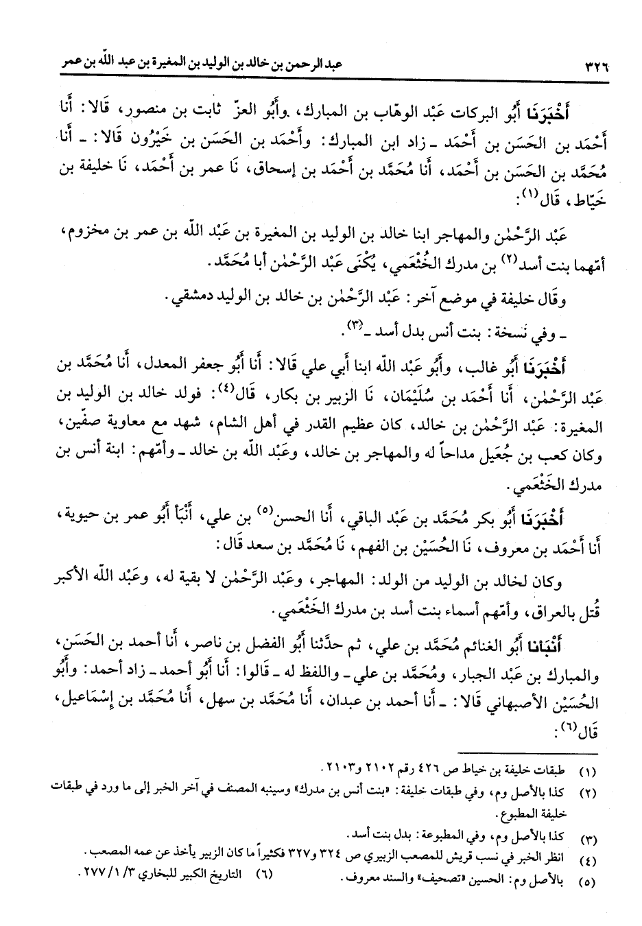 أخبرنا أبو البركات عبد الوهاب بن المبارك وأبو العز ثابت بن منصور قالا أنا أحمد بن الحسن بن أحمد زاد ابن المبارك وأحمد بن الحسن بن خيرون قالا أنا محمد بن الحسن بن أحمد أنا محمد بن أحمد بن إسحاق نا عمر بن أحمد نا خليفة بن خياط قال (1) عبد الرحمن والمهاجر ابنا خالد بن الوليد بن المغيرة بن عبد الله بن عمر بن مخزوم أمهما بنت أسد (2) بن مدرك الخثعمي يكنى عبد الرحمن أبا محمد وقال خليفة في موضع آخر عبد الرحمن بن خالد بن الوليد دمشقي وفي نسخة بنت أنس بدل أسد (3) أخبرنا أبو غالب وأبو عبد الله ابنا أبي علي قالا أنا أبو جعفر المعدل أنا محمد بن عبد الرحمن أنا أحمد بن سليمان نا الزبير بن بكار قال (4) فولد خالد بن الوليد بن المغيرة عبد الرحمن بن خالد كان عظيم القدر في أهل الشام شهد مع معاوية صفين وكان كعب بن جعيل مداحا له والمهاجر بن خالد وعبد الله بن خالد وأمهم ابنة أنس بن مدرك الخثعمي أخبرنا أبو بكر محمد بن عبد الباقي أنا الحسن (5) بن علي أنبأ أبو عمر بن حيوية أنا أحمد بن معروف نا الحسين بن الفهم نا محمد بن سعد قال وكان لخالد بن الوليد من الولد المهاجر وعبد الرحمن لا بقية له وعبد الله الأكبر قتل بالعراق وأمهم أسماء بنت أسد بن مدرك الخثعمي أنبأنا أبو الغنائم محمد بن علي ثم حدثنا أبو الفضل بن ناصر أنا أحمد بن الحسن والمبارك بن عبد الجبار ومحمد بن علي واللفظ له قالوا أنا أبو أحمد زاد أحمد وأبو الحسين الأصبهاني قالا أنا أحمد بن عبدان أنا محمد بن سهل أنا محمد بن إسماعيل قال (6)