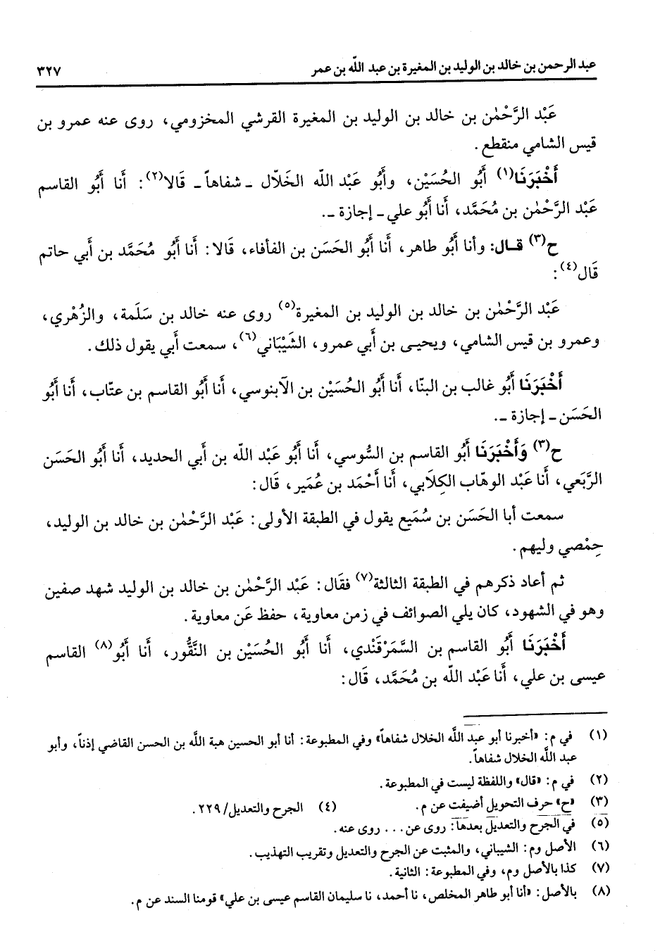 عبد الرحمن بن خالد بن الوليد بن المغيرة القرشي المخزومي روى عنه عمرو بن قيس الشامي منقطع أخبرنا (1) أبو الحسين وأبو عبد الله الخلال شفاها قالا (2) أنا أبو القاسم عبد الرحمن بن محمد أنا أبو علي إجازة ح (3) قال وأنا أبو طاهر أنا أبو الحسن بن الفأفاء قالا أنا أبو محمد بن أبي حاتم قال (4) عبد الرحمن بن خالد بن الوليد بن المغيرة (5) روى عنه خالد بن سلمة والزهري وعمرو بن قيس الشامي ويحيى بن أبي عمرو الشيباني (6) سمعت أبي يقول ذلك أخبرنا أبو غالب بن البنا أنا أبو الحسين بن الآبنوسي أنا أبو القاسم بن عتاب أنا أبو الحسن إجازة ح (3) وأخبرنا أبو القاسم بن السوسي أنا أبو عبد الله بن أبي الحديد أنا أبو الحسن الربعي أنا عبد الوهاب الكلابي أنا أحمد بن عمير قال سمعت أبا الحسن بن سميع يقول في الطبقة الأولى عبد الرحمن بن خالد بن الوليد حمصي وليهم ثم أعاد ذكرهم في الطبقة الثالثة (7) فقال عبد الرحمن بن خالد بن الوليد شهد صفين وهو في الشهود كان يلي الصوائف في زمن معاوية حفظ عن معاوية أخبرنا أبو القاسم بن السمرقندي أنا أبو الحسين بن النقور أنا أبو (8) القاسم عيسى بن علي أنا عبد الله بن محمد قال