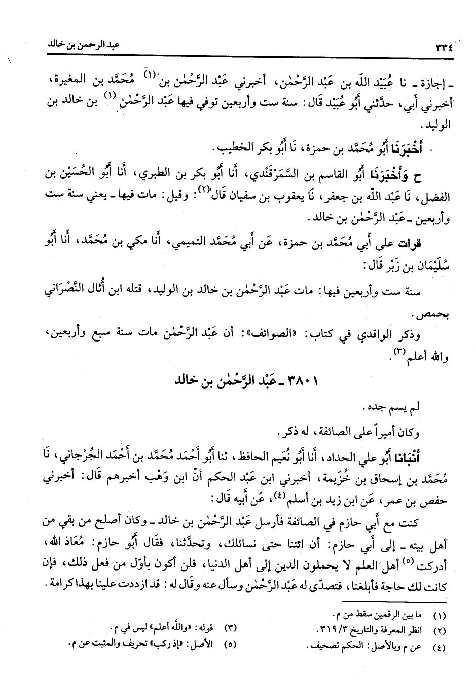 3801 - عبد الرحمن بن خالد لم يسم جده وكان أميرا على الصائفة له ذكر أنبأنا أبو علي الحداد أنا أبو نعيم الحافظ ثنا أبو أحمد محمد بن أحمد الجرجاني نا محمد بن إسحاق بن خزيمة أخبرني ابن عبد الحكم أن ابن وهب أخبرهم قال أخبرني حفص بن عمر عن ابن زيد بن أسلم (4) عن أبيه قال كنت مع أبي حازم في الصائفة فأرسل عبد الرحمن بن خالد وكان أصلح من بقي من أهل بيته إلى أبي حازم أن ائتنا حتى نسائلك وتحدثنا فقال أبو حازم معاذ الله أدركت (5) أهل العلم لا يحملون الدين إلى أهل الدنيا فلن أكون بأول من فعل ذلك فإن كانت لك حاجة فأبلغنا فتصدى له عبد الرحمن وسأل عنه وقال له قد ازددت علينا بهذا كرامة