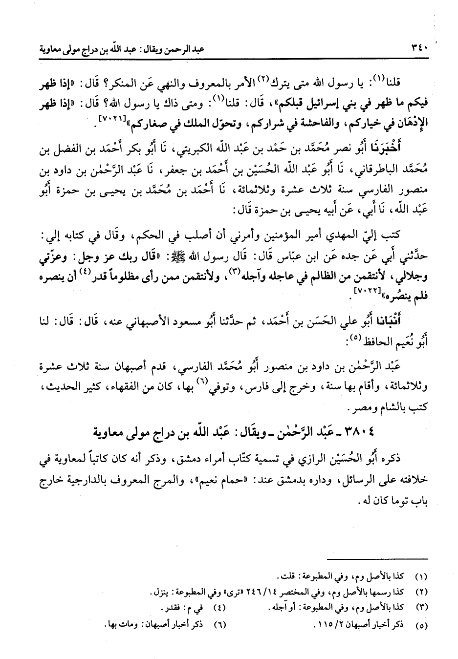 3804 - عبد الرحمن ويقال عبد الله بن دراج مولى معاوية ذكره أبو الحسين الرازي في تسمية كتاب أمراء دمشق وذكر أنه كان كاتبا لمعاوية في خلافته على الرسائل وداره بدمشق عند حمام نعيم والمرج المعروف بالدارجية خارج باب توما كان له "