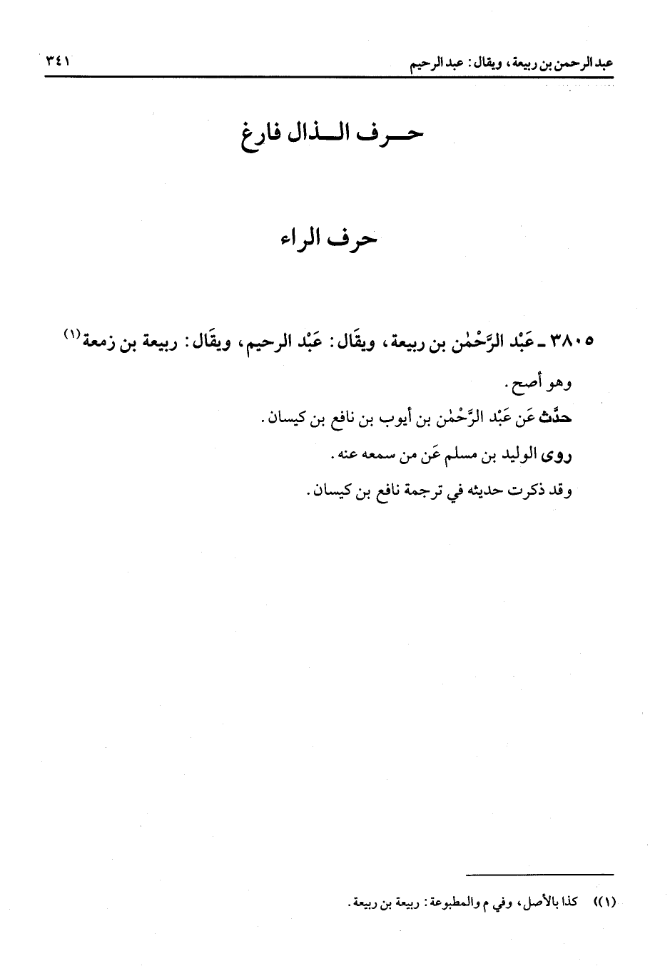 3805 - عبد الرحمن بن ربيعة ويقال عبد الرحيم ويقال ربيعة بن زمعة (1) وهو أصح حدث عن عبد الرحمن بن أيوب بن نافع بن كيسان روى الوليد بن مسلم عن من سمعه عنه وقد ذكرت حديثه في ترجمة نافع بن كيسان "