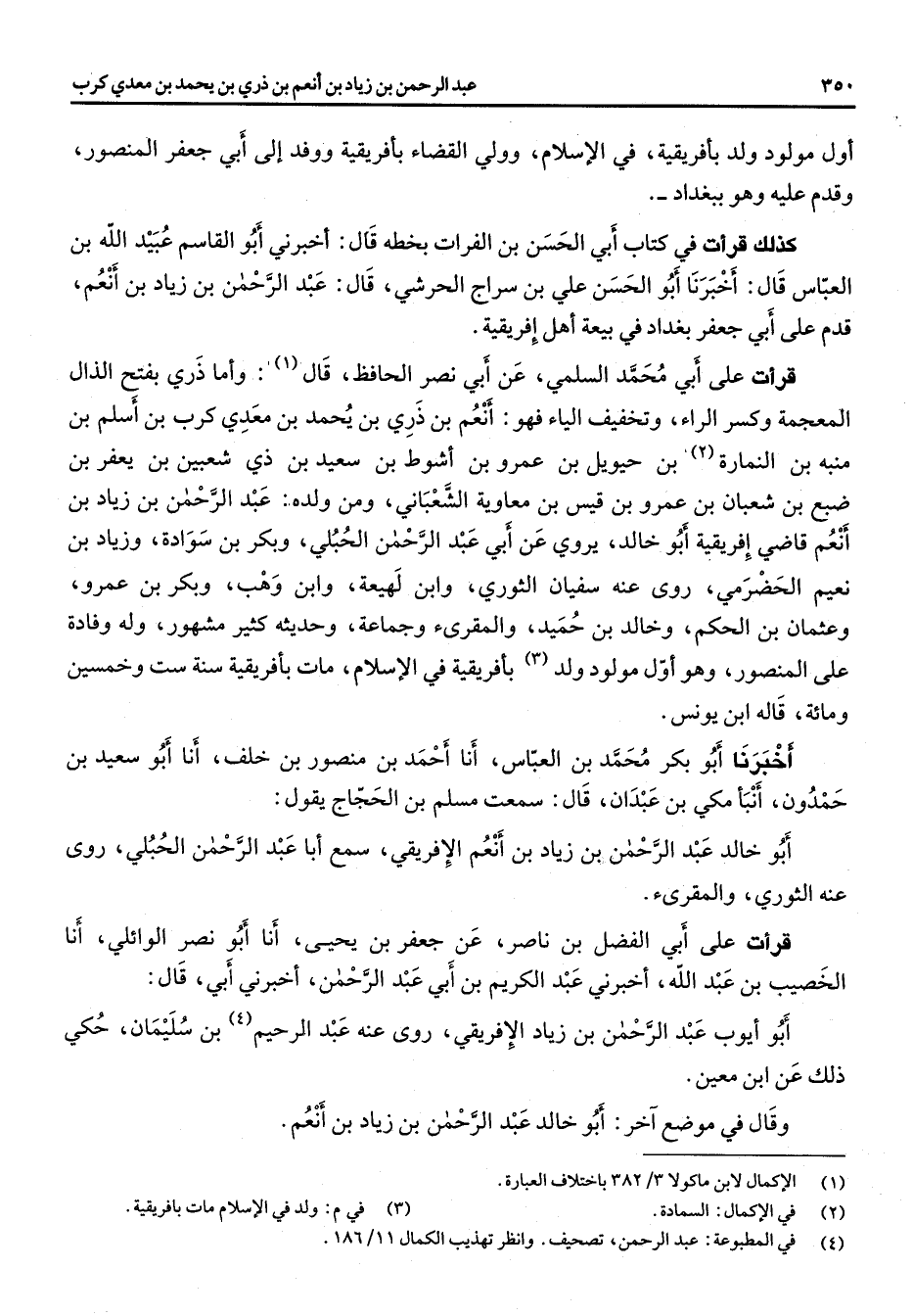 أول مولود ولد بأفريقية في الاسلام وولي القضاء بأفريقية ووفد الى أبي جعفر المنصور وقدم عليه وهو ببغداد كذلك قرأت في كتاب أبي الحسن بن الفرات بخطه قال أخبرني أبو القاسم عبيد الله بن العباس قال أخبرنا أبو الحسن علي بن سراج الحرشي قال عبد الرحمن بن زياد بن أنعم قدم على أبي جعفر بغداد في بيعة اهل افريقية قرأت على أبي محمد السلمي عن أبي نصر الحافظ قال (1) واما ذري بفتح الذال المعجمة وكسر الراء وتخفيف الياء فهو أنعم بن ذري بن يحمد بن معدي كرب بن أسلم بن منبه بن النمارة (2) بن حيويل بن عمرو بن أشوط بن سعيد بن ذي شعبين بن يعفر بن ضبع بن شعبان بن عمرو بن قيس بن معاوية الشعباني ومن ولده عبد الرحمن بن زياد بن أنعم قاضي افريقية أبو خالد يروي عن أبي عبد الرحمن الحبلي وبكر بن سوادة وزياد بن نعيم الحضرمي روى عنه سفيان الثوري وابن لهيعة وابن وهب وبكر بن عمرو وعثمان بن الحكم وخالد بن حميد والمقرئ وجماعة وحديثه كثير مشهور وله وفادة على المنصور وهو أول مولود ولد (3) بأفريقية في الاسلام مات بأفريقية سنة ست وخمسين ومائة قاله ابن يونس أخبرنا أبو بكر محمد بن العباس أنا أحمد بن منصور بن خلف انا أبو سعيد بن حمدون أنبأ مكي بن عبدان قال سمعت مسلم بن الحجاج يقول أبو خالد عبد الرحمن بن زياد بن أنعم الافريقي سمع أبا عبد الرحمن الحبلي روى عنه الثوري والمقرئ قرأت على أبي الفضل بن ناصر عن جعفر بن يحيى أنا أبو نصر الوائلي انا الخصيب بن عبد الله أخبرني عبد الكريم بن أبي عبد الرحمن أخبرني أبي قال أبو أيوب عبد الرحمن بن زياد الافريقي روى عنه عبد الرحيم (4) بن سليمان حكي ذلك عن ابن معين وقال في موضع آخر أبو خالد عبد الرحمن بن زياد بن أنعم