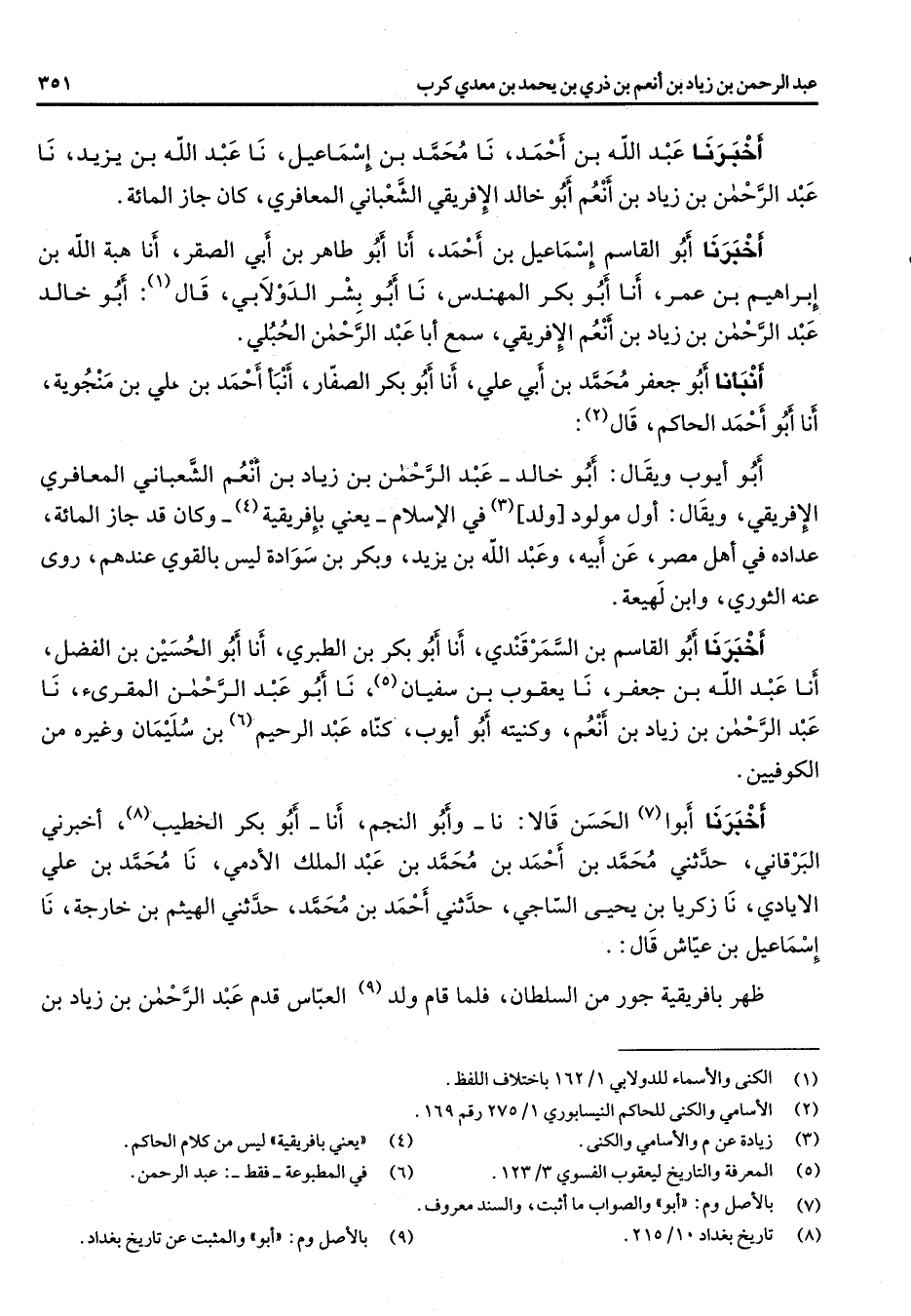 أخبرنا عبد الله بن أحمد نا محمد بن اسماعيل نا عبد الله بن يزيد نا عبد الرحمن بن زياد بن أنعم أبو خالد الافريقي الشعباني المعافري كان جاز المائة أخبرنا أبو القاسم اسماعيل بن أحمد انا أبو طاهر بن أبي الصقر أنا هبة الله بن ابراهيم بن عمر أنا أبو بكر المهندس نا أبو بشر الدولابي قال (1) أبو خالد عبد الرحمن بن زياد بن انعم الافريقي سمع أبا عبد الرحمن الحبلي أنبأنا أبو جعفر محمد بن أبي علي أنا أبو بكر الصفار انبأ أحمد بن علي بن منجويه انا أبو أحمد الحاكم قال (2) أبو أيوب ويقال أبو خالد عبد الرحمن بن زياد بن انعم الشعباني المعافري الافريقي ويقال اول مولود ولد (3) في الاسلام يعني بإفريقية (4) وكان قد جاز المائة عداده في أهل مصر عن أبيه وعبد الله بن يزيد وبكر بن سوادة ليس بالقوي عندهم روى عنه الثوري وابن لهيعة أخبرنا أبو القاسم بن السمرقندي انا أبو بكر بن الطبري انا أبو الحسين بن الفضل انا عبد الله بن جعفر نا يعقوب بن سفيان (5) نا أبو عبد الرحمن المقرئ نا عبد الرحمن بن زياد بن أنعم وكنيته أبو أيوب كناه عبد الرحيم (6) بن سليمان وغيره من الكوفيين أخبرنا أبوا (7) الحسن قالا نا وأبو النجم انا أبو بكر الخطيب (8) أخبرني البرقاني حدثني محمد بن أحمد بن محمد بن عبد الملك الأدمي نا محمد بن علي الايادي نا زكريا بن يحيى الساجي حدثني أحمد بن محمد حدثني الهيثم بن خارجة نا اسماعيل بن عياش قال ظهر بافريقية جور من السلطان فلما قام ولد (9) العباس قدم عبد الرحمن بن زياد بن