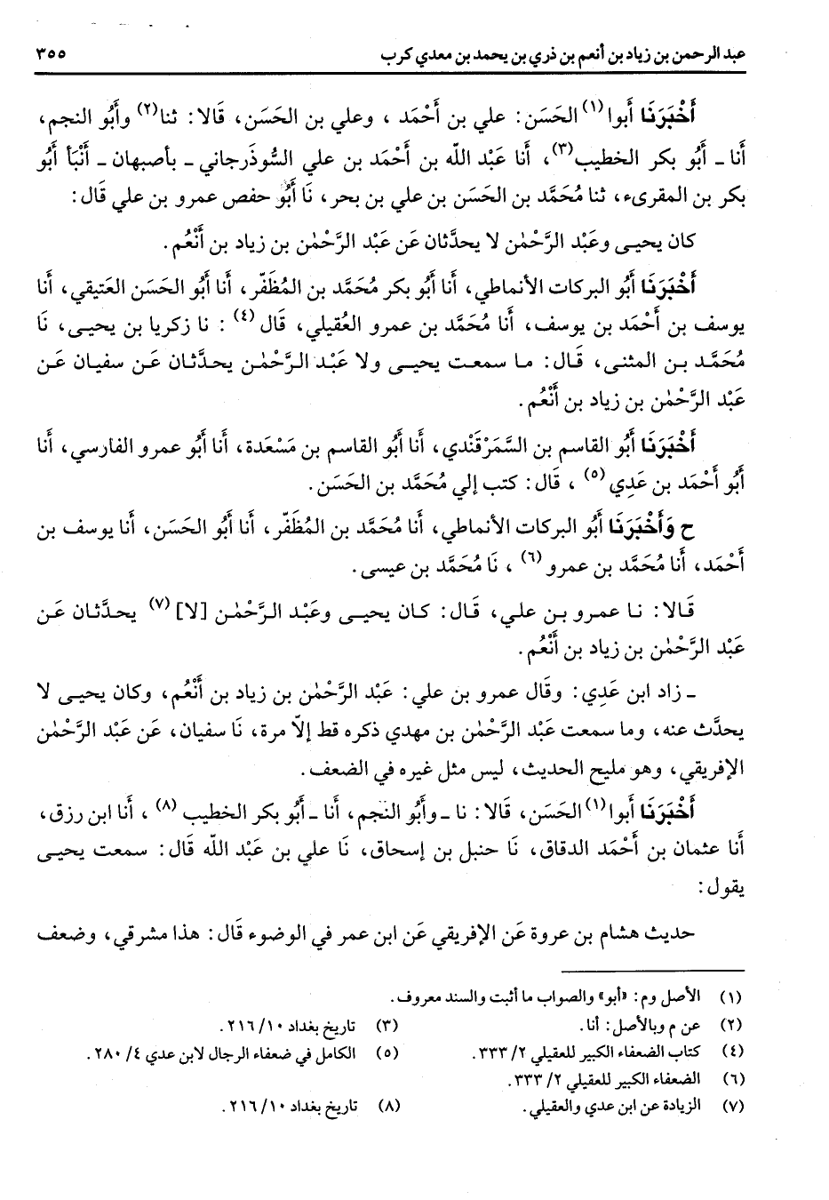 اخبرنا أبوا (1) الحسن علي بن أحمد وعلي بن الحسن قالا ثنا (2) وأبو النجم انا أبو بكر الخطيب (3) أنا عبد الله بن أحمد بن علي السوذرجاني بأصبهان انبأ أبو بكر بن المقرئ ثنا محمد بن الحسن بن علي بن بحر نا أبو حفص عمرو بن علي قال كان يحيى وعبد الرحمن لا يحدثان عن عبد الرحمن بن زياد بن أنعم أخبرنا أبو البركات الأنماطي انا أبو بكر محمد بن المظفر انا أبو الحسن العتيقي أنا يوسف بن أحمد بن يوسف أنا محمد بن عمرو العقيلي قال (4) نا زكريا بن يحيى نا محمد بن المثنى قال ما سمعت يحيى ولا عبد الرحمن يحدثان عن سفيان عن عبد الرحمن بن زياد بن أنعم أخبرنا أبو القاسم بن السمرقندي انا أبو القاسم بن مسعدة انا أبو عمرو الفارسي انا أبو احمد بن عدي (5) قال كتب الي محمد بن الحسن ح وأخبرنا أبو البركات الأنماطي انا محمد بن المظفر انا أبو الحسن أنا يوسف بن أحمد انا محمد بن عمرو (6) نا محمد بن عيسى قالا نا عمرو بن علي قال كان يحيى وعبد الرحمن لا (7) يحدثان عن عبد الرحمن بن زياد بن أنعم زاد ابن عدي وقال عمرو بن علي عبد الرحمن بن زياد بن أنعم وكان يحيى لا يحدث عنه وما سمعت عبد الرحمن بن مهدي ذكره قط الا مرة نا سفيان عن عبد الرحمن الافريقي وهو مليح الحديث ليس مثل غيره في الضعف أخبرنا أبوا (1) الحسن قالا نا وأبو النجم أنا أبو بكر الخطيب (8) أنا ابن رزق انا عثمان بن أحمد الدقاق نا حنبل بن اسحاق نا علي بن عبد الله قال سمعت يحيى يقول حديث هشام بن عروة عن الافريقي عن ابن عمر في الوضوء قال هذا مشرقي وضعف