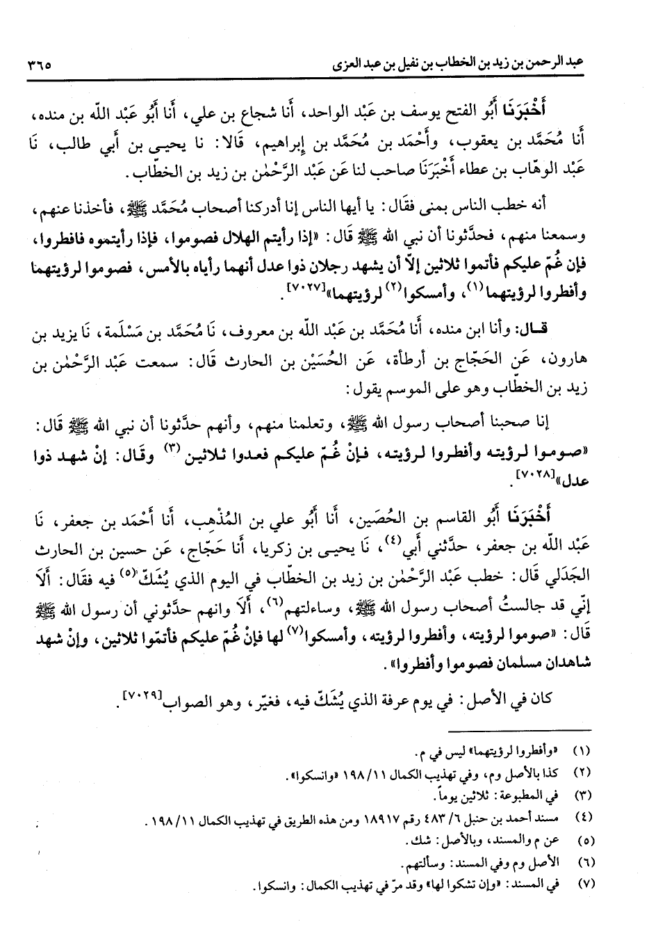 أخبرنا أبو الفتح يوسف بن عبد الواحد انا شجاع بن علي انا أبو عبد الله بن منده انا محمد بن يعقوب وأحمد بن محمد بن ابراهيم قالا نا يحيى بن أبي طالب نا عبد الوهاب بن عطاء أخبرنا صاحب لنا عن عبد الرحمن بن زيد بن الخطاب انه خطب الناس بمنى فقال يا أيها الناس انا أدركنا أصحاب محمد (صلى الله عليه وسلم) فأخذنا عنهم وسمعنا منهم فحدثونا ان نبي الله (صلى الله عليه وسلم) قال إذا رأيتم الهلال فصوموا فإذا رأيتموه فافطروا فإن غم عليكم فأتموا ثلاثين الا ان يشهد رجلان ذوا عدل أنهما رأياه بالأمس فصوموا لرؤيتهما وأفطروا لرؤيتهما (1) وأمسكوا (2) لرؤيتهما