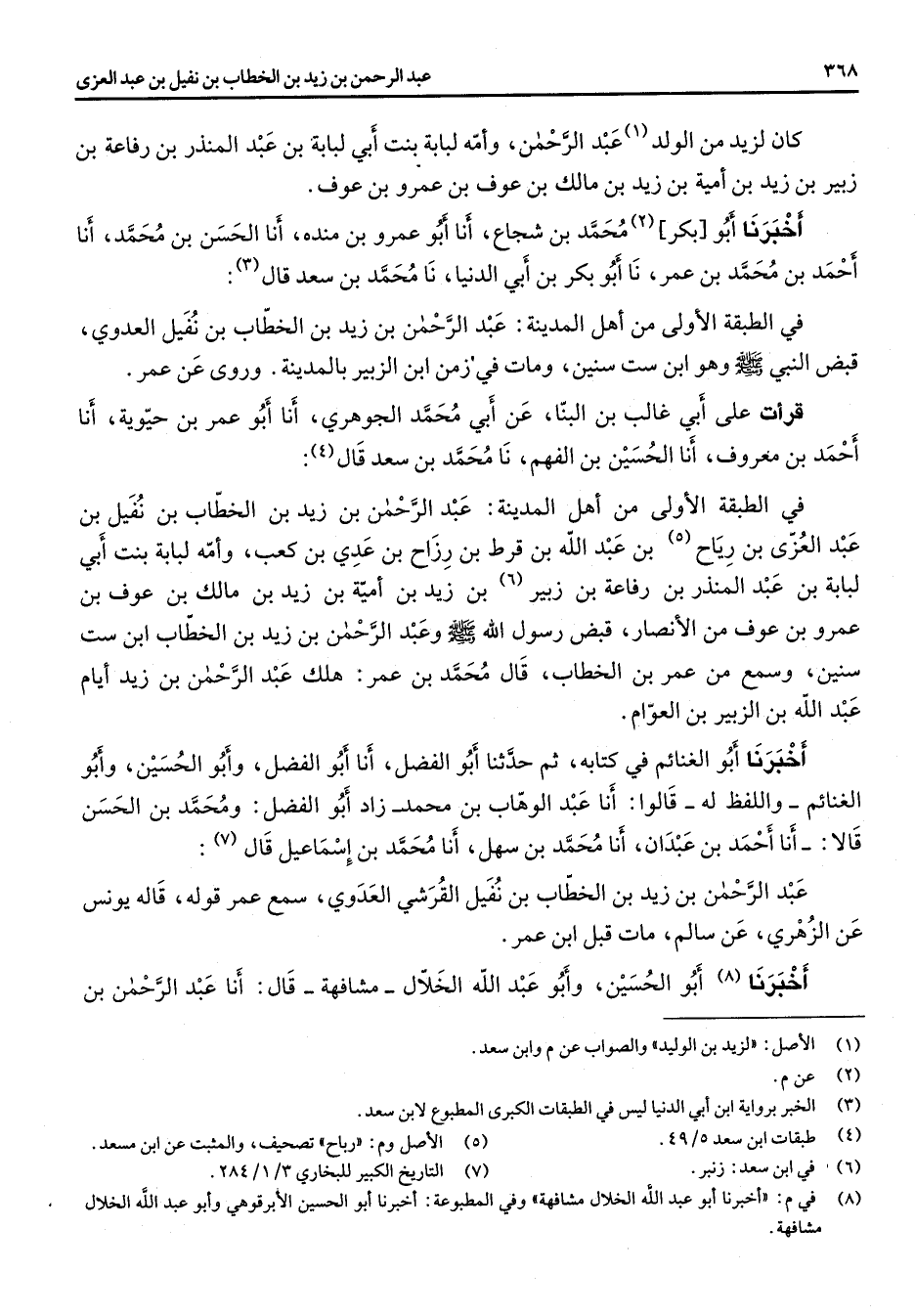 كان لزيد من الولد (1) عبد الرحمن وامه لبابة بنت أبي لبابة بن عبد المنذر بن رفاعة بن زبير بن زيد بن أمية بن زيد بن مالك بن عوف بن عمرو بن عوف أخبرنا أبو بكر (2) محمد بن شجاع أنا أبو عمرو بن منده أنا الحسن بن محمد أنا أحمد بن محمد بن عمر نا أبو بكر بن أبي الدنيا نا محمد بن سعد قال (3) في الطبقة الأولى من أهل المدينة عبد الرحمن بن زيد بن الخطاب بن نفيل العدوي قبض النبي (صلى الله عليه وسلم) وهو ابن ست سنين ومات في زمن ابن الزبير بالمدينة وروى عنه عمر قرأت على أبي غالب بن البنا عن أبي محمد الجوهري أنا أبو عمر بن حيوية أنا أحمد بن معروف أنا الحسين بن الفهم نا محمد بن سعد قال (4) في الطبقة الأولى من أهل المدينة عبد الرحمن بن زيد بن الخطاب بن نفيل بن عبد العزى بن رياح (5) بن عبد الله بن قرط بن رزاح بن عدي بن كعب وأمه لبابة بنت أبي لبابة بن عبد المنذر بن رفاعة بن زبير (6) بن زيد بن أمية بن زيد بن مالك بن عوف بن عمرو بن عوف من الأنصار قبض رسول الله (صلى الله عليه وسلم) وعبد الرحمن بن زيد بن الخطاب ابن ست سنين وسمع من عمر بن الخطاب قال محمد بن عمر هلك عبد الرحمن بن زيد أيام عبد الله بن الزبير بن العوام أخبرنا أبو الغنائم في كتابه ثم حدثنا أبو الفضل أنا أبو الفضل وأبو الحسين وأبو الغنائم واللفظ له قالوا أنا عبد الوهاب بن محمد زاد أبو الفضل ومحمد بن الحسن قالا أنا أحمد بن عبدان انا محمد بن سهل أنا محمد بن اسماعيل قال (7) عبد الرحمن بن زيد بن الخطاب بن نفيل القرشي العدوي سمع عمر قوله قاله يونس عن الزهري عن سالم مات قبل ابن عمر أخبرنا (8) أبو الحسين وأبو عبد الله الخلال مشافهة قال أنا عبد الرحمن بن