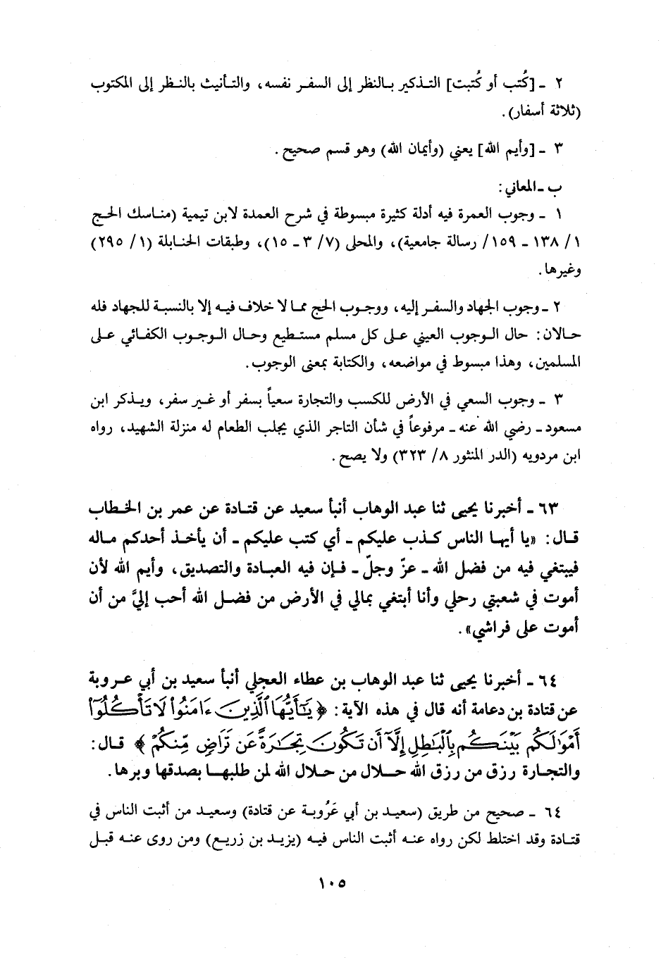 63 - أَخْبَرَنَا يَحْيَى، ثنا عَبْدُ الْوَهَّابِ بْنُ عَطَاءٍ الْعِجْلِيُّ، أَنْبَأَ سَعِيدُ بْنُ أَبِي عَرُوبَةَ، عَنْ قَتَادَةَ بْنِ دِعَامَةَ، أَنَّهُ قَالَ فِي هَذِهِ الْآيَةِ: {يَا أَيُّهَا الَّذِينَ آمَنُوا لَا تَأْكُلُوا أَمْوَالَكُمْ بَيْنَكُمْ بِالْبَاطِلِ إِلَّا أَنْ تَكُونَ تِجَارَةً عَنْ تَرَاضٍ مِنْكُمْ} [النساء: 29] ، قَالَ: «§وَالتِّجَارَةُ رِزْقٌ مِنْ رِزْقِ اللَّهِ، حَلَالٌ مِنْ حَلَالِ اللَّهِ، لِمَنْ طَلَبَهَا بِصِدْقِهَا وَبِرِّهَا»