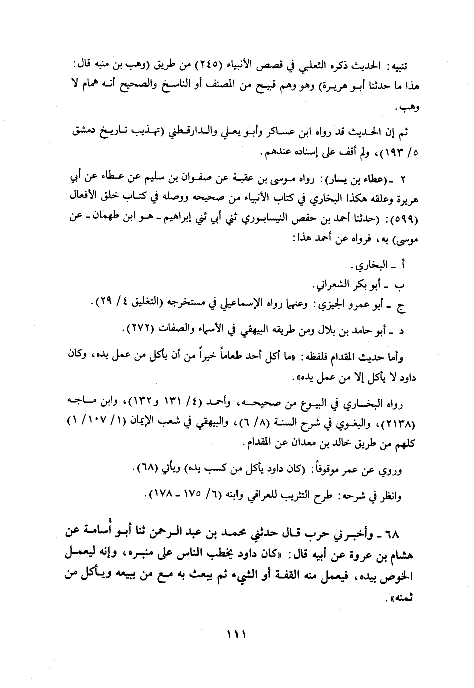 67 - وَأَخْبَرَنِي حَرْبٌ، قَالَ: حَدَّثَنِي مُحَمَّدُ بْنُ عَبْدِ الرَّحْمَنِ، ثنا أَبُو أُسَامَةَ، عَنْ هِشَامِ بْنِ عُرْوَةَ، عَنْ أَبِيهِ، قَالَ: «كَانَ §دَاوُدُ يَخْطُبُ النَّاسَ عَلَى مِنْبَرِهِ، وَإِنَّهُ لَيَعْمَلُ الْخُوصَ بِيَدِهِ، فَيَعْمَلُ مِنْهُ الْقُفَّةَ أَوِ الشَّيْءَ، ثُمَّ يَبْعَثُ بِهِ مَعَ مَنْ يَبِيعُهُ وَيَأْكُلُ مِنْ ثَمَنِهِ»