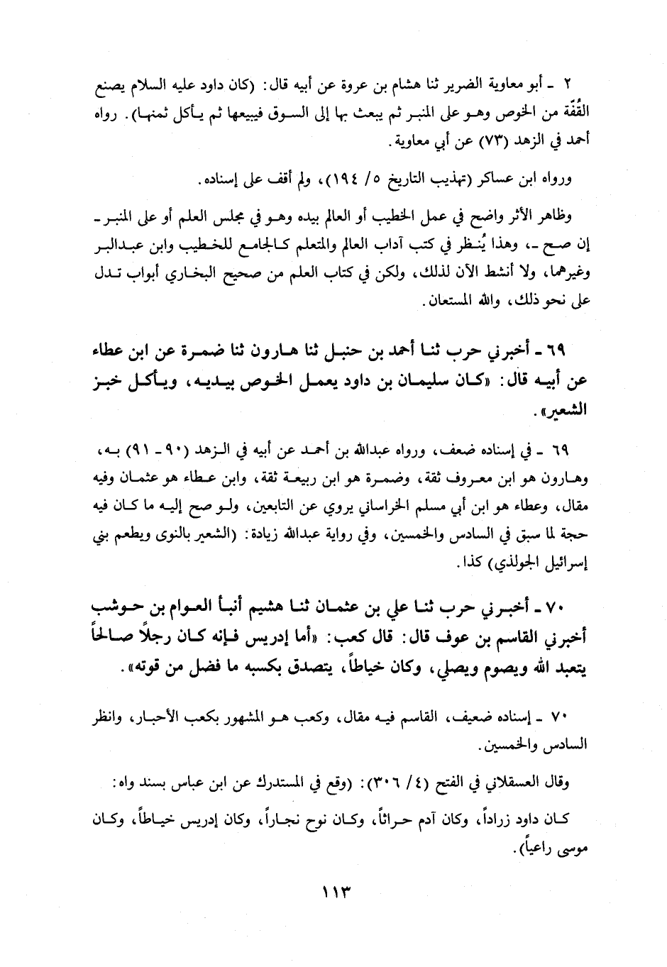 68 - أَخْبَرَنِي حَرْبٌ، ثنا أَحْمَدُ بْنُ حَنْبَلٍ، ثنا هَارُونُ، ثنا ضَمْرَةُ، عَنِ ابْنِ عَطَاءٍ، عَنْ أَبِيهِ، قَالَ: «كَانَ سُلَيْمَانُ بْنُ دَاوُدَ §يَعْمَلُ الْخُوصَ بِيَدَيْهِ وَيَأْكُلُ خُبْزَ الشَّعِيرِ»