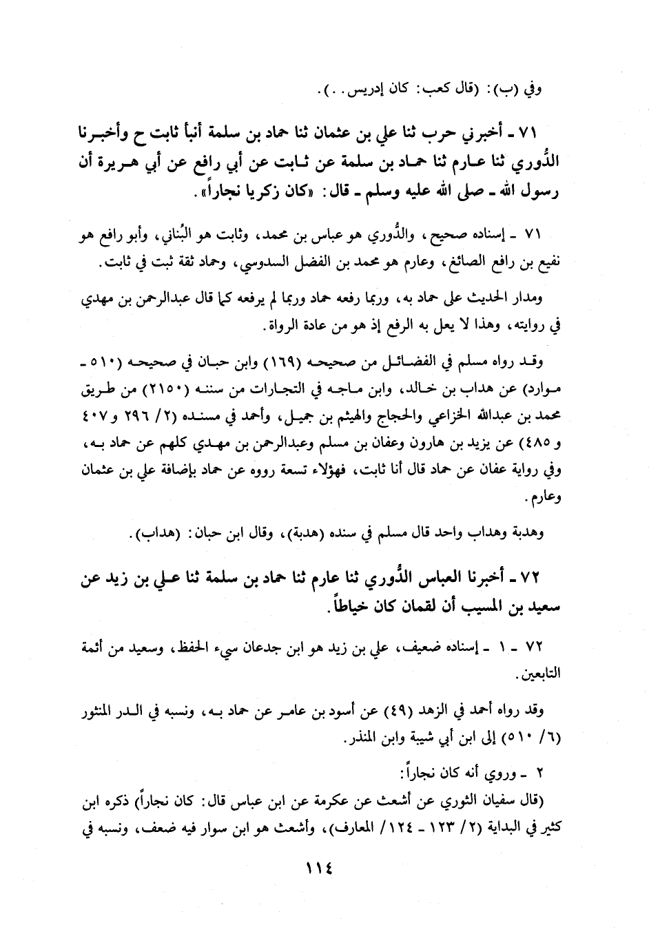 71 - أَخْبَرَنَا الْعَبَّاسُ الدُّورِيُّ، ثنا عَارِمٌ، ثنا حَمَّادُ بْنُ سَلَمَةَ، ثنا عَلِيُّ بْنُ زَيْدٍ، عَنْ سَعِيدِ بْنِ الْمُسَيِّبِ، أَنَّ §لُقْمَانَ، كَانَ خَيَّاطًا