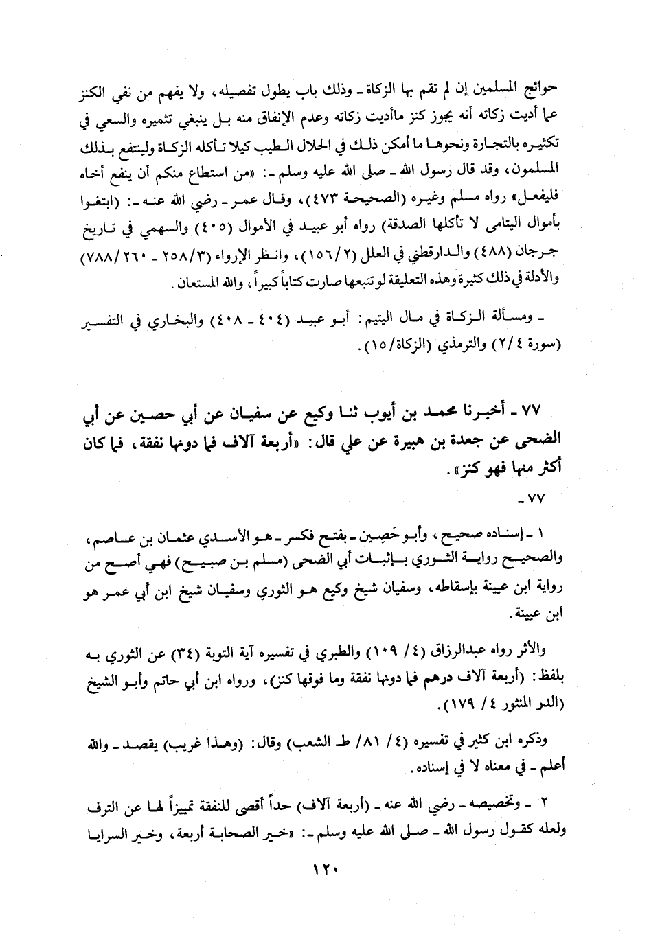 76 - أَخْبَرَنَا مُحَمَّدُ بْنُ أَيُّوبَ، ثنا وَكِيعٌ، عَنْ سُفْيَانَ، عَنْ أَبِي حَصِينٍ، عَنْ أَبِي الضُّحَى، عَنْ جَعْدَةَ بْنِ هُبَيْرَةَ، عَنْ عَلِيٍّ، قَالَ: «§أَرْبَعَةُ آلَافٍ فَمَا دُونَهَا نَفَقَةٌ، فَمَا كَانَ أَكْثَرَ مِنْهَا فَهُوَ كَنْزٌ»