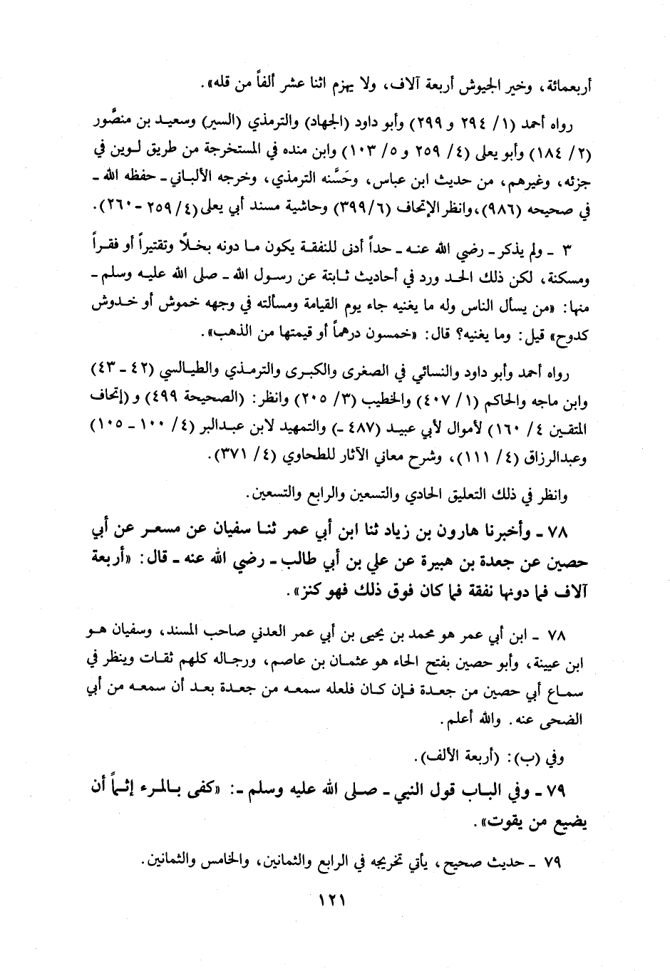77 - وَأَخْبَرَنَا هَارُونُ بْنُ زِيَادٍ، ثنا ابْنُ أَبِي عُمَرَ، ثنا سُفْيَانُ، عَنْ مِسْعَرٍ، عَنْ أَبِي حَصِينٍ، عَنْ جَعْدَةَ بْنِ هُبَيْرَةَ، عَنْ عَلِيِّ بْنِ أَبِي طَالِبٍ، رَضِيَ اللَّهُ عَنْهُ قَالَ: §أَرْبَعَةُ آلَافٍ فَمَا دُونَهَا نَفَقَةٌ، فَمَا كَانَ فَوْقَ ذَلِكَ فَهُوَ كَنْزٌ وَفِي الْبَابِ قَوْلُ النَّبِيِّ صَلَّى اللهُ عَلَيْهِ وَسَلَّمَ: كَفَى بِالْمَرْءِ إِثْمًا أَنْ يُضَيِّعَ مَنْ يَقُوتُ