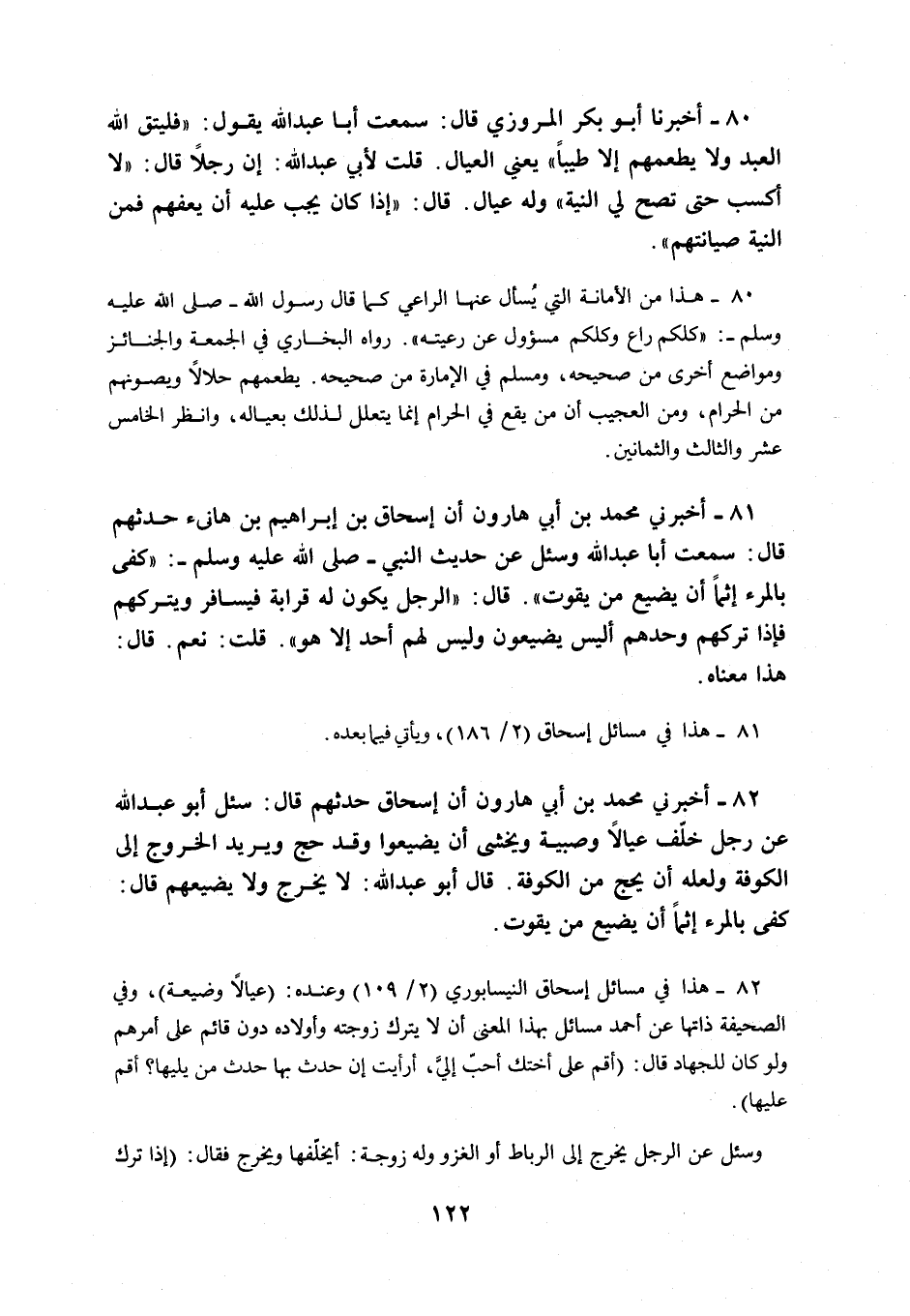 79 - أَخْبَرَنِي مُحَمَّدُ بْنُ أَبِي هَارُونَ، أَنَّ إِسْحَاقَ بْنَ إِبْرَاهِيمَ بْنِ هَانِئٍ حَدَّثَهُمْ، قَالَ سَمِعْتُ أَبَا عَبْدِ اللَّهِ، وَسُئِلَ، عَنْ حَدِيثِ النَّبِيِّ، صَلَّى اللهُ عَلَيْهِ وَسَلَّمَ: «كَفَى بِالْمَرْءِ إِثْمًا أَنْ يُضَيِّعَ مَنْ يَقُوتُ» قَالَ: «§الرَّجُلُ يَكُونُ لَهُ قَرَابَةٌ فَيُسَافِرُ وَيَتْرُكُهُمْ، فَإِذَا تَرَكَهُمْ وَحْدَهُمْ أَلَيْسَ يَضِيعُونَ وَلَيْسَ لَهُمْ أَحَدٌ إِلَّا هُوَ؟» قُلْتُ: نَعَمْ، قَالَ: «هَذَا مَعْنَاهُ»