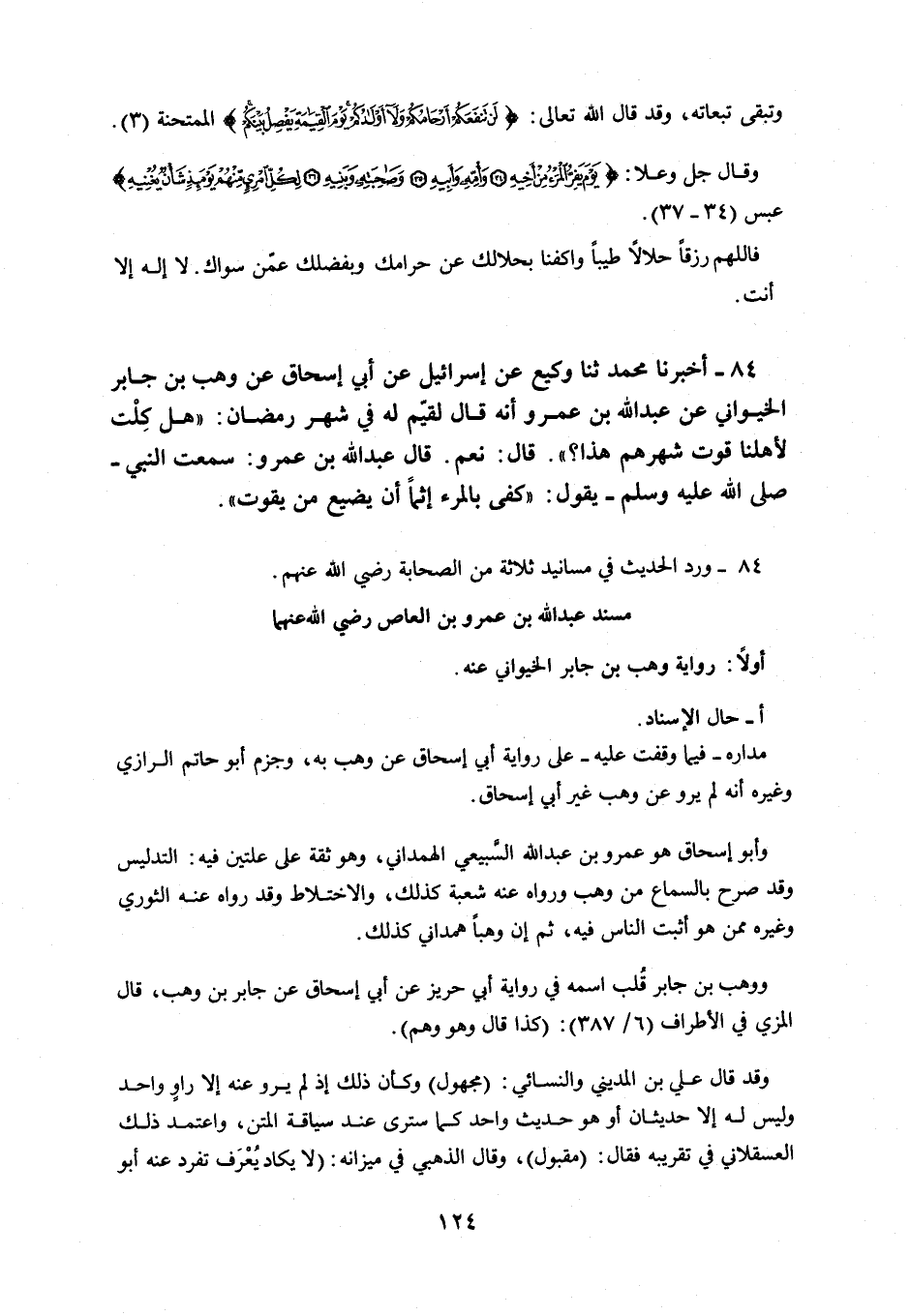 82 - أَخْبَرَنَا مُحَمَّدٌ، ثنا وَكِيعٌ، عَنْ إِسْرَائِيلَ، عَنْ أَبِي إِسْحَاقَ، عَنْ وَهْبِ بْنِ جَابِرٍ الْخَيْوَانِيِّ، عَنْ عَبْدِ اللَّهِ بْنِ عَمْرٍو، أَنَّهُ قَالَ لِقَيِّمٍ لَهُ فِي شَهْرِ رَمَضَانَ: هَلْ كِلْتَ لِأَهْلِنَا قُوتَ شَهْرِهِمْ هَذَا؟ قَالَ: نَعَمْ، قَالَ عَبْدُ اللَّهِ بْنُ عَمْرٍو: سَمِعْتُ النَّبِيَّ صَلَّى اللهُ عَلَيْهِ وَسَلَّمَ يَقُولُ: «§كَفَى بِالْمَرْءِ إِثْمًا أَنْ يُضَيِّعَ مَنْ يَقُوتُ»