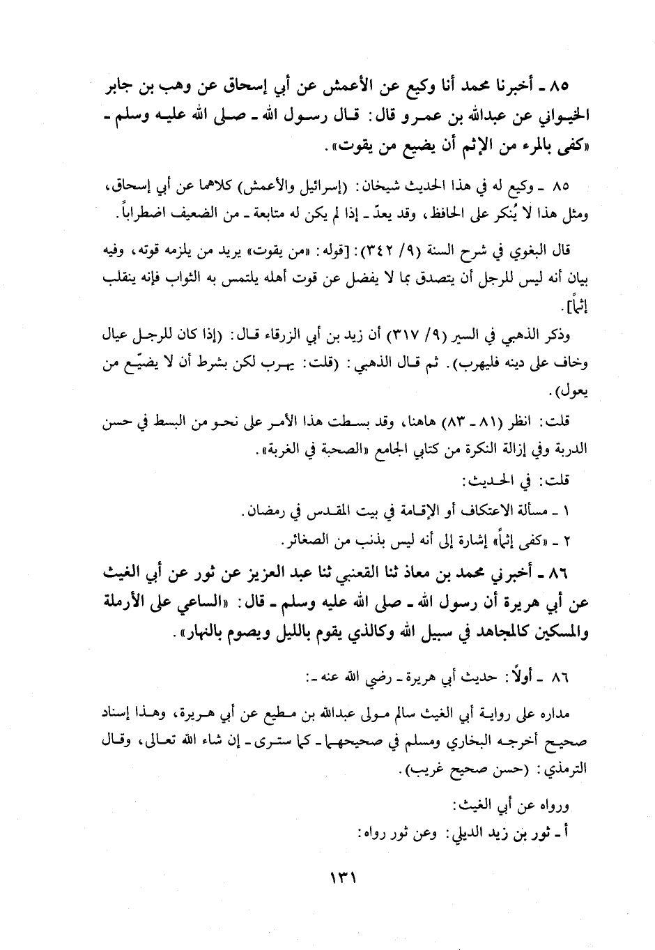 83 - أَخْبَرَنَا مُحَمَّدٌ، أنا وَكِيعٌ، عَنِ الْأَعْمَشِ، عَنْ أَبِي إِسْحَاقَ، عَنْ وَهْبِ بْنِ جَابِرٍ الْخَيْوَانِيِّ، عَنْ عَبْدِ اللَّهِ بْنِ عَمْرٍو، قَالَ: قَالَ رَسُولُ اللَّهِ صَلَّى اللهُ عَلَيْهِ وَسَلَّمَ: " §كَفَى بِالْمَرْءِ مِنَ الْإِثْمِ أَنْ يُضَيِّعَ مَنْ يَقُوتُ