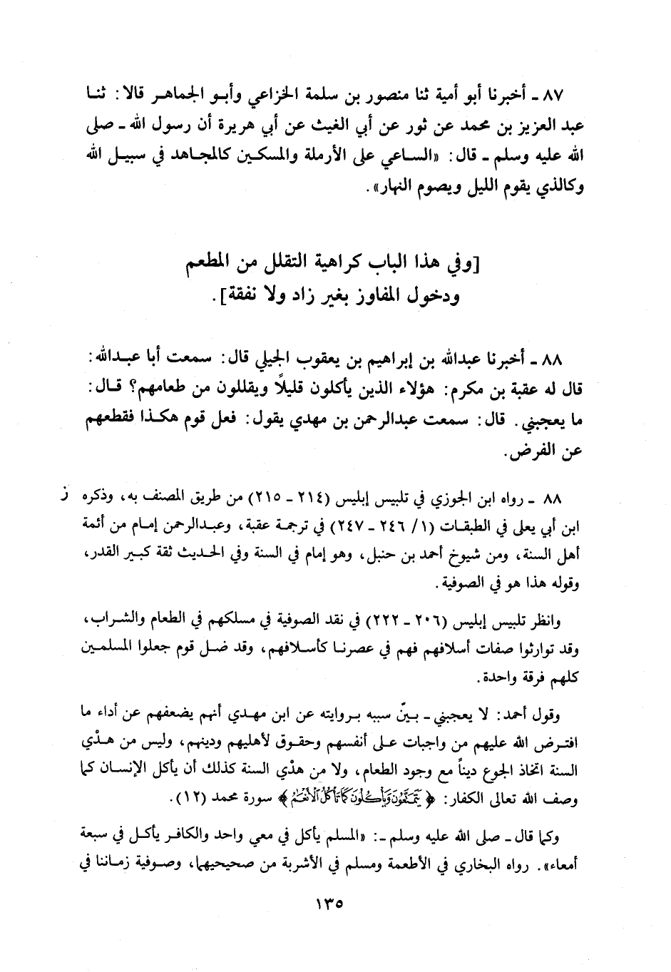 86 - أَخْبَرَنَا عَبْدُ اللَّهِ بْنُ إِبْرَاهِيمَ بْنِ يَعْقُوبَ الْحَنْبَلِيُّ، قَالَ سَمِعْتُ أَبَا عَبْدِ اللَّهِ، قَالَ لَهُ عُقْبَةُ بْنُ مُكْرَمٍ: §هَؤُلَاءِ الَّذِينَ يَأْكُلُونَ قَلِيلًا، وَيُقَلِّلُونَ مِنْ طَعَامِهِمْ؟ قَالَ: مَا يُعْجِبُنِي، قَالَ: سَمِعْتُ عَبْدَ الرَّحْمَنِ بْنَ مَهْدِيٍّ يَقُولُ: فَعَلَ قَوْمٌ هَكَذَا فَقَطَعَهُمْ عَنِ الْفَرْضِ