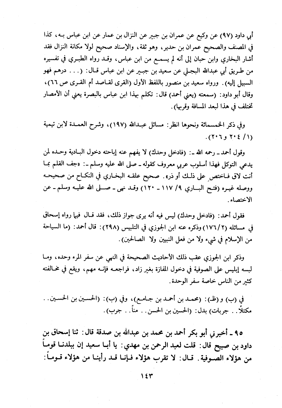 93 - أَخْبَرَنِي أَبُو بَكْرٍ أَحْمَدُ بْنُ مُحَمَّدِ بْنِ عَبْدِ اللَّهِ بْنِ صَدَقَةَ، قَالَ: ثنا إِسْحَاقُ بْنُ دَاوُدَ بْنِ صُبَيْحٍ، قَالَ قُلْتُ لِعَبْدِ الرَّحْمَنِ بْنِ مَهْدِيٍّ: يَا أَبَا سَعِيدٍ، إِنَّ §بِبَلَدِنَا قَوْمًا مِنْ هَؤُلَاءِ الصُّوفِيَّةِ، قَالَ: لَا تَقْرُبْ هَؤُلَاءِ، فَإِنَّا قَدْ رَأَيْنَا مِنْ هَؤُلَاءِ قَوْمًا، -[144]- فَبَعْضُهُمْ أَخْرَجَهُمُ الْأَمْرُ إِلَى الْجُنُونِ وَبَعْضُهُمْ أَخْرَجَهُمْ إِلَى الزَّنْدَقَةِ. ثُمَّ قَالَ: خَرَجَ سُفْيَانُ الثَّوْرِيُّ فِي سَفَرٍ فَشَيَّعْتُهُ، فَكَانَ مَعَهُ سُفْرَةٌ فِيهَا الْفَالُوذَجُ، وَكَانَ فِيهَا حَمَلٌ
