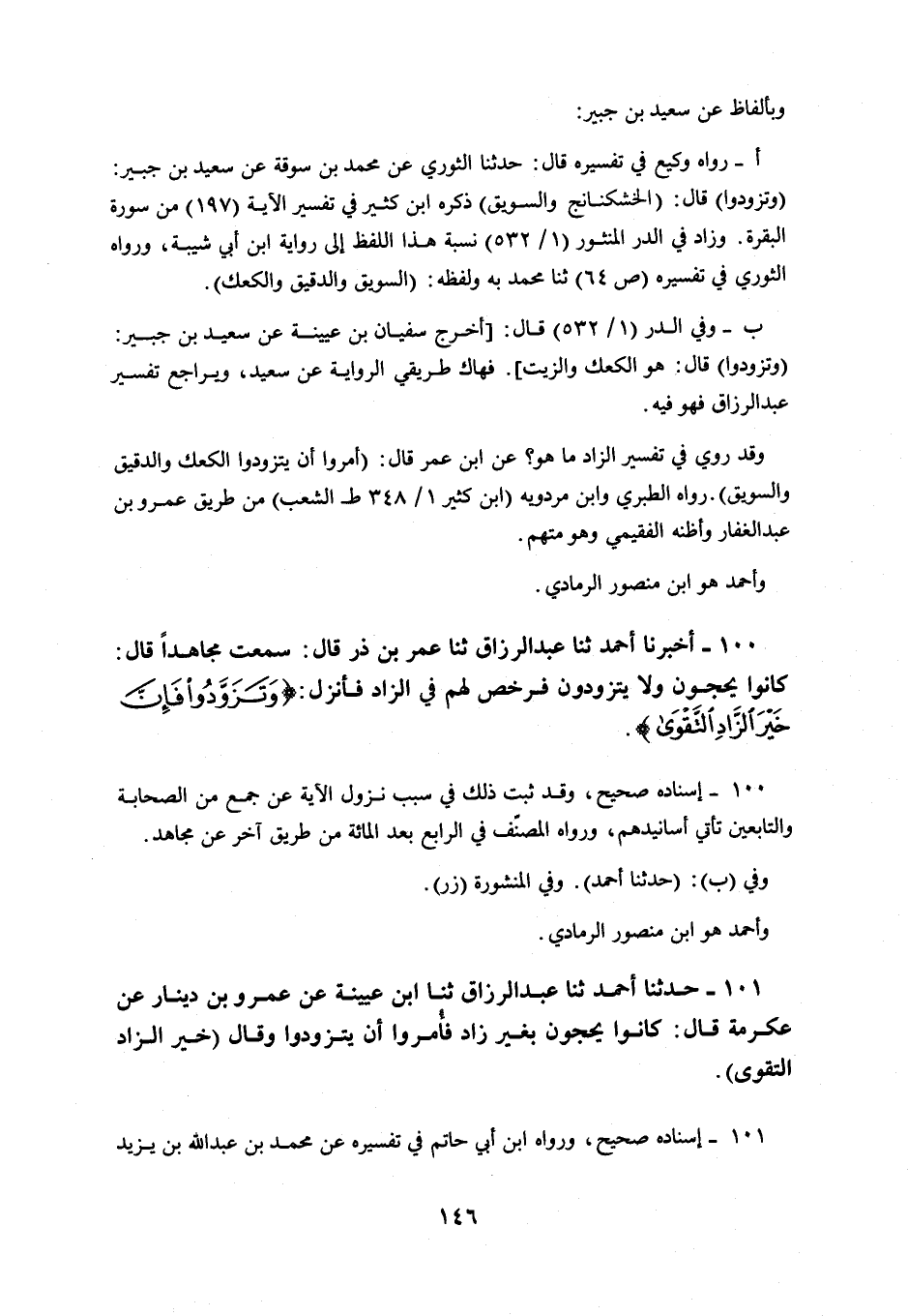 98 - أَخْبَرَنَا أَحْمَدُ، ثنا عَبْدُ الرَّزَّاقِ، ثنا عُمَرُ بْنُ ذَرٍّ، قَالَ: سَمِعْتُ مُجَاهِدًا، قَالَ: §كَانُوا يَحُجُّونَ وَلَا يَتَزَوَّدُونَ، فَرُخِّصَ لَهُمْ فِي الزَّادِ، فَأُنْزِلَ {وَتَزَوَّدُوا فَإِنَّ خَيْرَ الزَّادِ التَّقْوَى} [البقرة: 197]