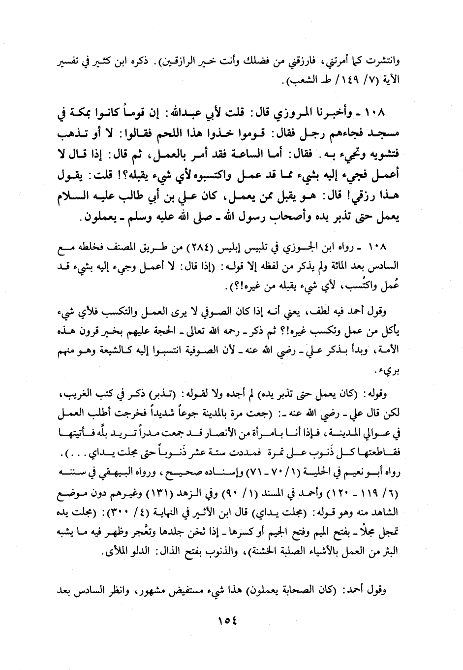 106 - وَأَخْبَرَنَا الْمَرُّوذِيُّ، قَالَ قُلْتُ لِأَبِي عَبْدِ اللَّهِ: إِنَّ قَوْمًا كَانُوا بِمَكَّةَ فِي مَسْجِدٍ، فَجَاءَهُمْ رَجُلٌ فَقَالَ: قُومُوا خُذُوا هَذَا اللَّحْمَ، فَقَالُوا: لَا، أَوْ تَذْهَبَ فَتَشْوِيَهُ وَتَجِيءَ بِهِ، فَقَالَ: أَمَّا السَّاعَةَ فَقَدْ أُمِرَ بِالْعَمَلِ، ثُمَّ قَالَ: إِذَا قَالَ: لَا أَعْمَلُ، فَجِيءَ إِلَيْهِ بِشَيْءٍ مِمَّا قَدْ عُمِلَ وَاكْتَسَبُوهُ، لِأَيِّ شَيْءٍ يَقْبَلُهُ؟ قُلْتُ: يَقُولُ: هَذَا رِزْقِي، قَالَ: هُوَ يَقْبَلُ مِمَّنْ يَعْمَلُ، «§كَانَ عَلِيُّ بْنُ أَبِي طَالِبٍ عَلَيْهِ السَّلَامُ يَعْمَلُ حَتَّى تَدْبَرَ يَدُهُ وَأَصْحَابُ رَسُولِ اللَّهِ صَلَّى اللهُ عَلَيْهِ وَسَلَّمَ يَعْمَلُونَ»