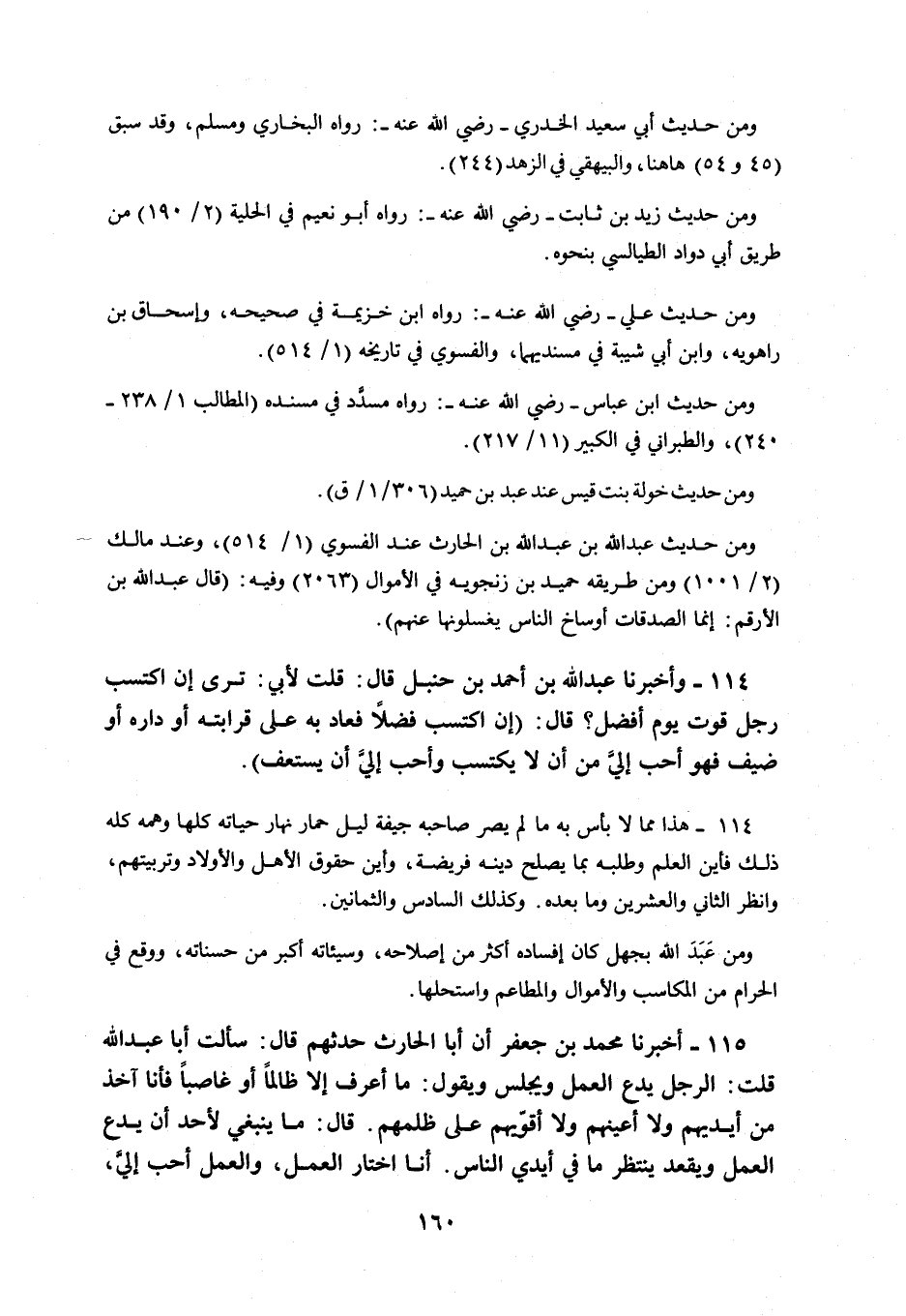 113 - أَخْبَرَنَا مُحَمَّدُ بْنُ جَعْفَرٍ، أَنَّ أَبَا الْحَارِثِ، حَدَّثَهُمْ، قَالَ: سَأَلْتُ أَبَا عَبْدِ اللَّهِ، قُلْتُ: §الرَّجُلُ يَدَعُ الْعَمَلَ وَيَجْلِسُ، وَيَقُولُ: مَا أَعْرِفُ إِلَّا ظَالِمًا أَوْ غَاصِبًا، فَأَنَا آخُذُ مِنْ أَيْدِيهِمْ، وَلَا أُعِينُهُمْ، وَلَا أُقَوِّيهِمْ عَلَى ظُلْمِهِمْ. قَالَ: مَا يَنْبَغِي لِأَحَدٍ أَنْ يَدَعَ الْعَمَلَ، وَيَقْعُدَ يَنْتَظِرُ مَا فِي أَيْدِي النَّاسِ، أَنَا أَخْتَارُ الْعَمَلَ، وَالْعَمَلُ أَحَبُّ إِلَيَّ. -[161]- إِذَا جَلَسَ الرَّجُلُ وَلَمْ يَحْتَرِفْ، دَعَتْهُ نَفْسُهُ إِلَى أَنْ يَأْخُذَ مَا فِي أَيْدِي النَّاسِ، فَإِذَا أَعْطَوْهُ أَوْ مَنَعُوهُ أَشْغَلَ نَفْسَهُ بِالْعَمَلِ. وَالِاكْتِسَابُ تَرْكُ الطَّمَعِ، قَالَ صَلَّى اللهُ عَلَيْهِ وَسَلَّمَ: «لِأَنْ يَحْمِلَ الرَّجُلُ حَبْلًا فَيَحْتَطِبَ ثُمَّ يَبِيعَهُ فِي السُّوقِ، وَيَسْتَغْنِيَ بِهِ خَيْرٌ لَهُ مِنْ أَنْ يَسْأَلَ النَّاسَ أَعْطَوْهُ أَوْ مَنَعُوهُ» . فَقَدْ أَخْبَرَ النَّبِيُّ صَلَّى اللهُ عَلَيْهِ وَسَلَّمَ أَنَّ الْعَمَلَ خَيْرٌ مِنَ الْمَسْأَلَةِ، وَقَالَ اللَّهُ تَعَالَى: {فَاسْعَوْا إِلَى ذَكَرِ اللَّهِ وَذَرُوا الْبَيْعَ} [الجمعة: 9] ، فَقَوْلُهُ هَذَا إِذَنْ مِنَ الشِّرَاءِ وَالْبَيْعِ، وَأَنَا أَخْتَارُ لِلرَّجُلِ الِاضْطِرَابَ فِي طَلَبِ الرِّزْقِ، وَالِاسْتِغْنَاءَ عَمَّا فِي أَيْدِي النَّاسِ، وَهُوَ عِنْدِي أَفْضَلُ. قُلْتُ: إِنَّ هَاهُنَا قَوْمًا يَقُولُونَ: نَحْنُ مُتَوَكِّلُونَ، وَلَا نَرَى الْعَمَلَ إِلَّا بِغَيْرِ الظَّلَمَةِ وَالْقُضَاةِ، وَذَلِكَ أَنِّي لَا أَعْرِفُ إِلَّا ظَالِمًا، فَقَالَ أَبُو عَبْدِ اللَّهِ: مَا أَحْسَنَ الِاتِّكَالَ عَلَى اللَّهِ عَزَّ وَجَلَّ، وَلَكِنْ لَا يَنْبَغِي لِأَحَدٍ أَنْ يَقْعُدَ وَلَا يَعْمَلَ شَيْئًا حَتَّى يُطْعِمَهُ هَذَا وَهَذَا، وَنَحْنُ نَخْتَارُ الْعَمَلَ، وَنَطْلُبُ الرِّزْقَ، وَنَسْتَغْنِي عَنِ الْمَسْأَلَةِ، وَالِاسْتِغْنَاءُ عَنِ النَّاسِ بِالْعَمَلِ أَحَبُّ إِلَيَّ مِنَ الْمَسْأَلَةِ