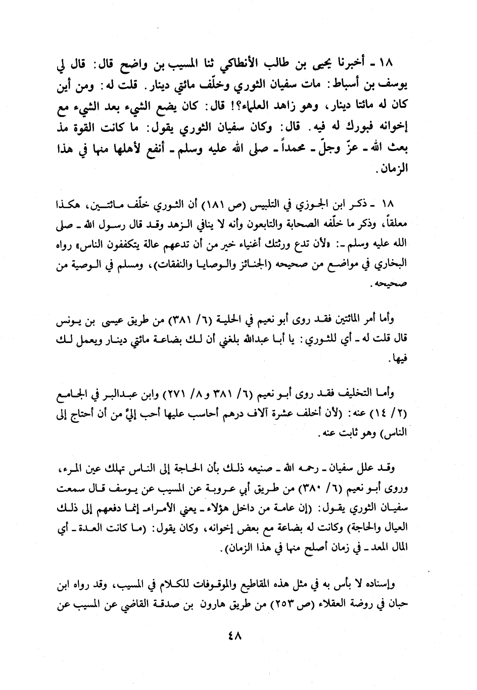 18 - أَخْبَرَنَا يَحْيَى بْنُ طَالِبٍ الْأَنْطَاكِيُّ، ثنا الْمُسَيَّبُ بْنُ وَاضِحٍ، قَالَ: قَالَ لِي يُوسُفُ بْنُ أَسْبَاطٍ: §مَاتَ سُفْيَانُ الثَّوْرِيُّ وَخَلَّفَ مِائَتَيْ دِينَارٍ، قُلْتُ لَهُ: وَمِنْ أَيْنَ كَانَ لَهُ مِائَتَا دِينَارٍ وَهُوَ زَاهِدُ الْعُلَمَاءِ؟ قَالَ: كَانَ يَضَعُ الشَّيْءَ بَعْدَ الشَّيْءِ مَعَ إِخْوَانِهِ، فَبُورِكَ لَهُ فِيهِ. قَالَ: وَكَانَ سُفْيَانُ الثَّوْرِيُّ يَقُولُ: مَا كَانَتِ الْقُوَّةُ مُذْ بَعَثَ اللَّهُ عَزَّ وَجَلَّ مُحَمَّدًا صَلَّى اللهُ عَلَيْهِ وَسَلَّمَ أَنْفَعُ لِأَهْلِهَا مِنْهَا فِي هَذَا الزَّمَانِ
