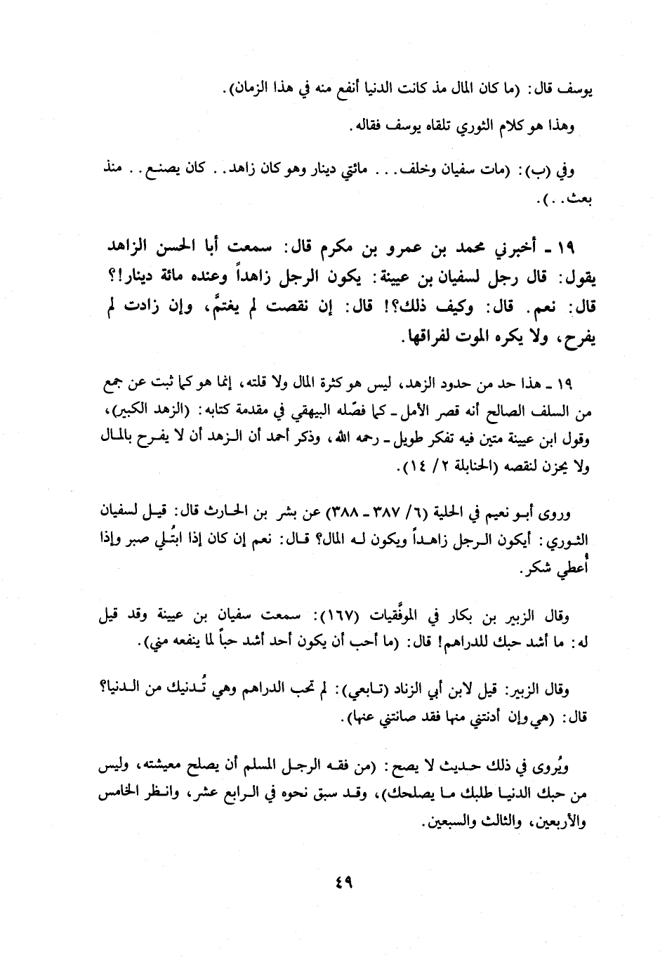 19 - أَخْبَرَنِي مُحَمَّدُ بْنُ عَمْرِو بْنِ مُكْرَمٍ، قَالَ: سَمِعْتُ أَبَا الْحَسَنِ الزَّاهِدَ، يَقُولُ: قَالَ رَجُلٌ لِسُفْيَانَ بْنِ عُيَيْنَةَ: §يَكُونُ الرَّجُلُ زَاهِدًا وَعِنْدَهُ مِئَةُ دِينَارٍ؟ قَالَ: «نَعَمْ» ، قَالَ: وَكَيْفَ ذَلِكَ؟ قَالَ: «إِنْ نَقَصَتْ لَمْ يَغْتَمْ، وَإِنْ زَادَتْ لَمْ يَفْرَحْ، وَلَا يَكْرَهُ الْمَوْتَ لِفِرَاقِهَا»