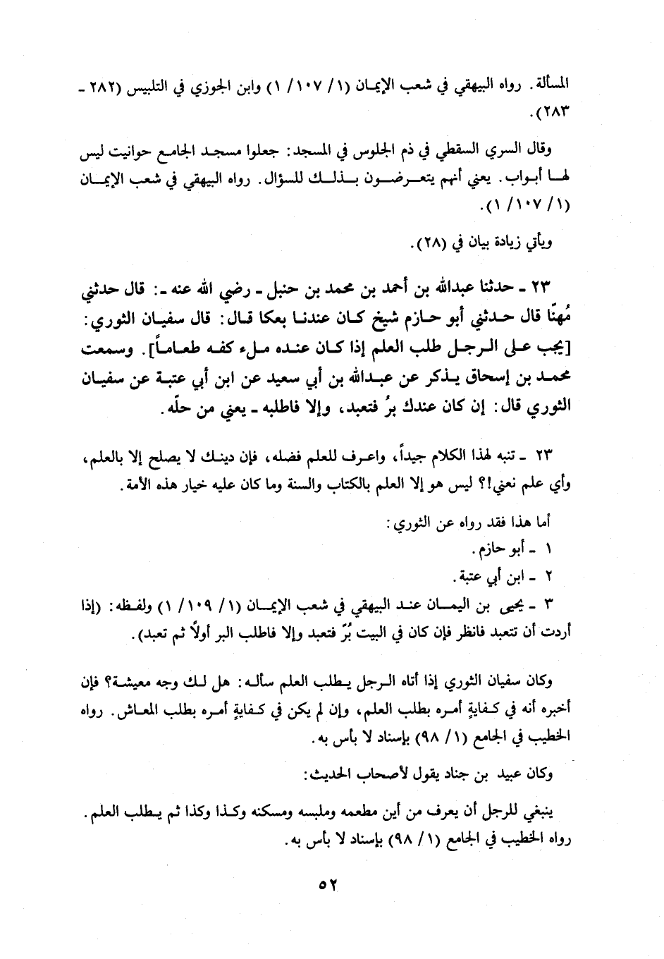 23 - حَدَّثَنَا عَبْدُ اللَّهِ بْنُ أَحْمَدَ بْنِ مُحَمَّدِ بْنِ حَنْبَلٍ، رَضِيَ اللَّهُ عَنْهُ، قَالَ: حَدَّثَنِي مُهَنَّا، قَالَ: حَدَّثَنِي أَبُو حَازِمٍ، شَيْخٌ كَانَ عِنْدَنَا بِعَكَّا، قَالَ: قَالَ سُفْيَانُ الثَّوْرِيُّ: §يَجِبُ عَلَى الرَّجُلِ طَلَبُ الْعِلْمِ إِذَا كَانَ عِنْدَهُ مِلْءُ كَفِّهِ طَعَامًا. وَسَمِعْتُ مُحَمَّدَ بْنَ إِسْحَاقَ يَذْكُرُ عَنْ عَبْدِ اللَّهِ بْنِ أَبِي سَعِيدٍ، عَنِ ابْنِ أَبِي عُتْبَةَ، عَنْ سُفْيَانَ الثَّوْرِيِّ قَالَ: إِنْ كَانَ عِنْدَكَ بُرٌّ فَتَعَبَّدْ، وَإِلَّا فَاطْلُبْهُ يَعْنِي مِنْ حِلِّهِ
