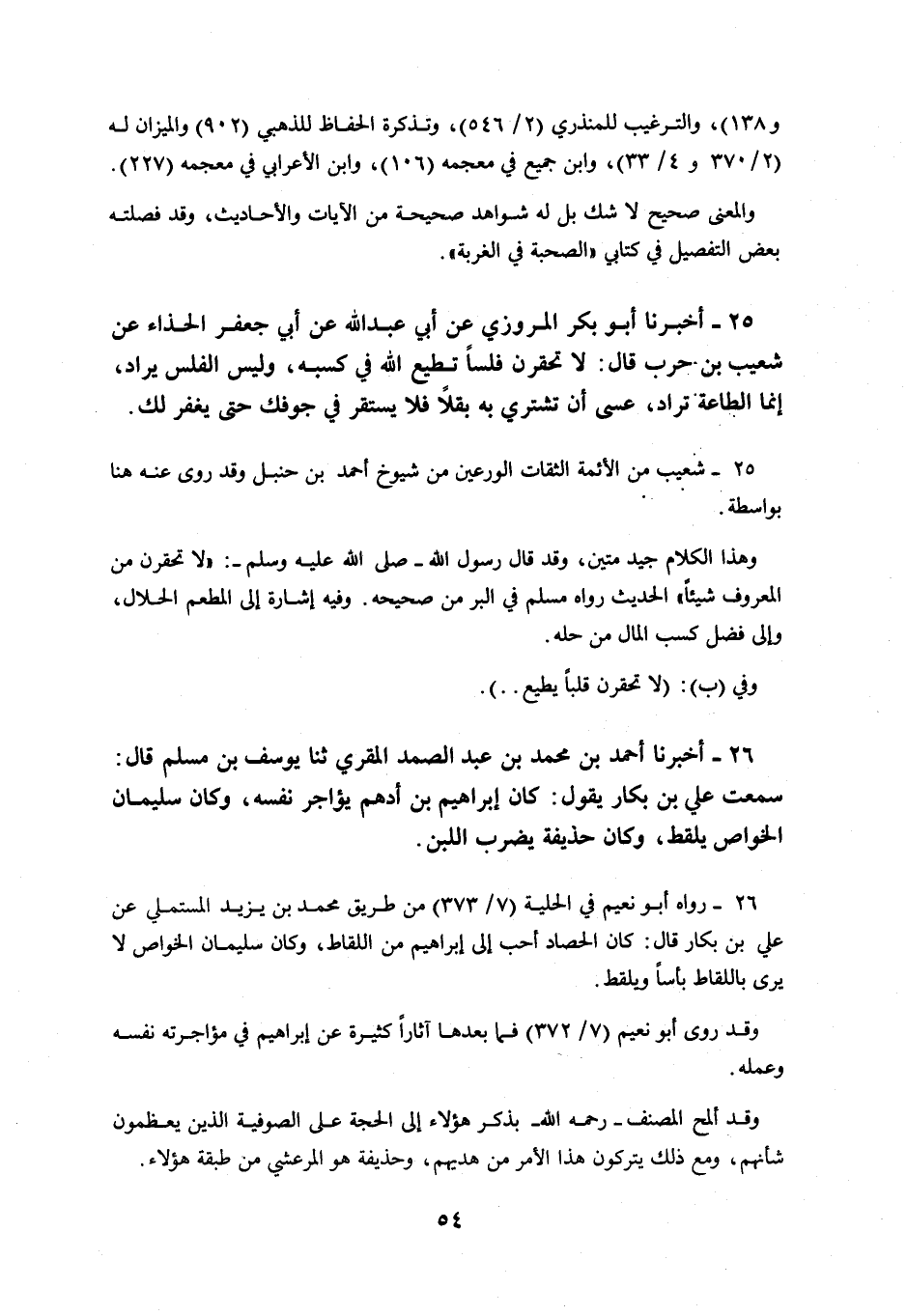 25 - أَخْبَرَنَا أَبُو بَكْرٍ الْمَرُّوذِيُّ، عَنْ أَبِي عَبْدِ اللَّهِ، عَنْ أَبِي جَعْفَرٍ الْحَذَّاءِ، عَنْ شُعَيْبِ بْنِ حَرْبٍ، قَالَ: «§لَا تَحْقِرَنَّ فِلْسًا تُطِيعُ اللَّهَ فِي كَسْبِهِ، لَيْسَ الْفِلْسُ يُرَادُ، إِنَّمَا الطَّاعَةُ تُرَادُ، عَسَى أَنْ تَشْتَرِيَ بِهِ بَقْلًا فَلَا يَسْتَقِرُّ فِي جَوْفِكَ حَتَّى يُغْفَرَ لَكَ»