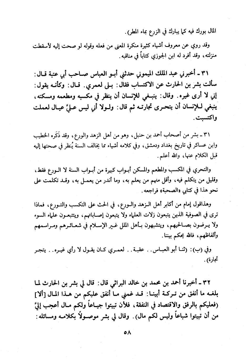 31 - أَخْبَرَنِي عَبْدُ الْمَلِكِ الْمَيْمُونِيُّ، حَدَّثَنِي أَبُو الْعَبَّاسِ، صَاحِبُ أَبِي عُتْبَةَ، قَالَ: سَأَلْتُ بِشْرَ بْنَ الْحَارِثِ عَنِ الِاكْتِسَابِ، فَقَالَ: «بَلَى لَعَمْرِي» ، قَالَ: وَكَأَنَّهُ يَقُولُ: إِنِّي لَا أَرَى غَيْرَهُ. وَقَالَ: «§يَنْبَغِي لِلْإِنْسَانِ أَنْ يَنْظُرَ فِي مَكْسَبِهِ وَمَطْعَمِهِ وَمَسْكَنِهِ، يَنْبَغِي لِلْإِنْسَانِ أَنْ يَتَحَرَّى تِجَارَتَهُ» . ثُمَّ قَالَ: «وَلَوْلَا أَنِّي لَيْسَ عَلَيَّ عِيَالٌ لَعَمِلْتُ وَاكْتَسَبْتُ»