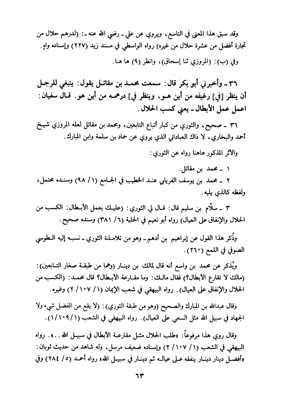 36 - وَأَخْبَرَنِي أَبُو بَكْرٍ، قَالَ: سَمِعْتُ مُحَمَّدَ بْنَ مُقَاتِلٍ، يَقُولُ: §يَنْبَغِي لِلرَّجُلِ أَنْ يَنْظُرَ، رَغِيفَهُ مِنْ أَيْنَ هُوَ؟ وَدِرْهَمَهُ مِنْ أَيْنَ هُوَ؟ قَالَ سُفْيَانُ: اعْمَلْ عَمَلَ الْأَبْطَالِ يَعْنِي كَسْبَ الْحَلَالِ