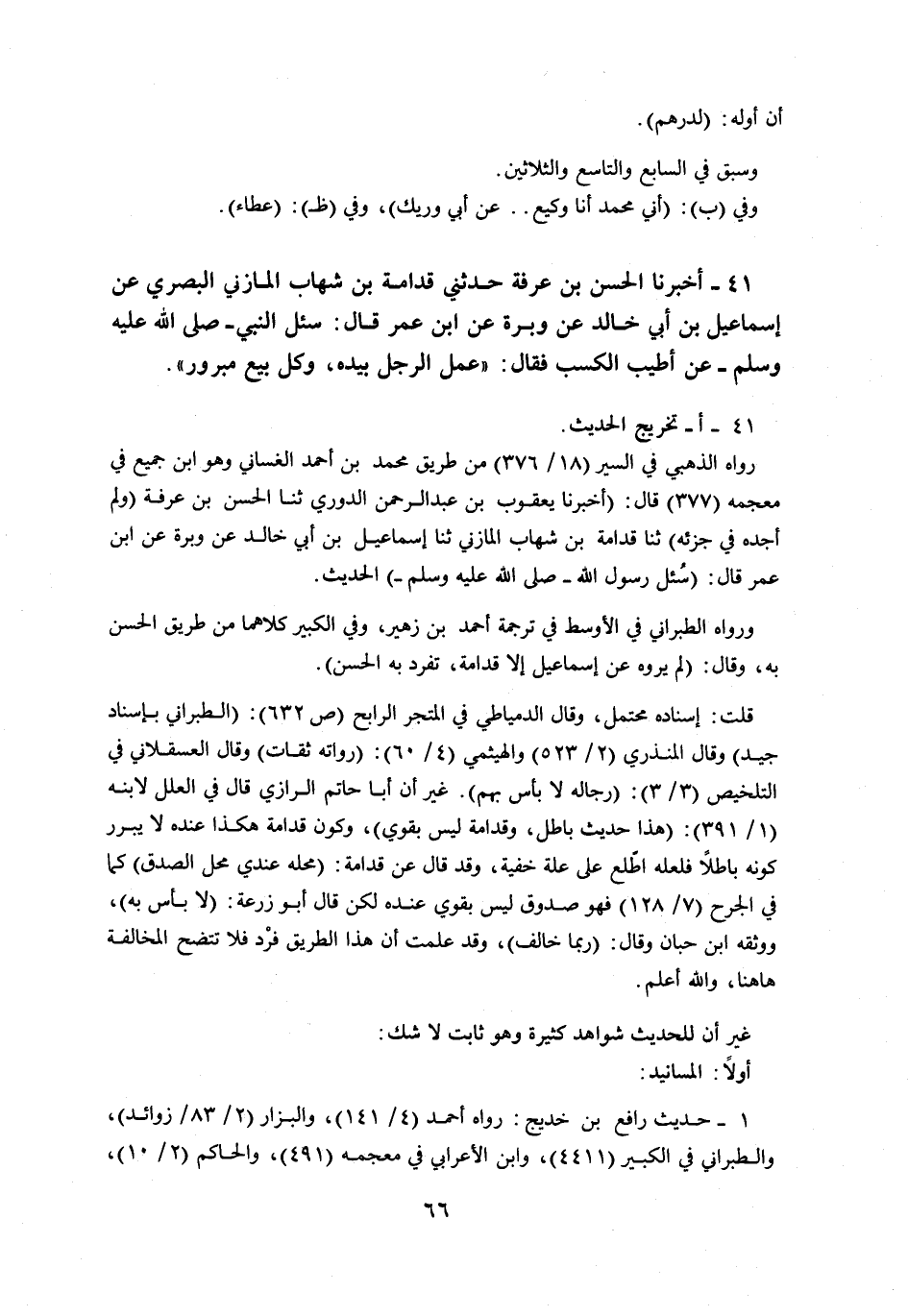 40 - أَخْبَرَنَا الْحَسَنُ بْنُ عَرَفَةَ، حَدَّثَنِي قُدَامَةُ بْنُ شِهَابٍ الْمَازِنِيُّ الْبَصْرِيُّ، عَنْ إِسْمَاعِيلَ بْنِ أَبِي خَالِدٍ، عَنْ وَبَرَةَ، عَنِ ابْنِ عُمَرَ، قَالَ: سُئِلَ النَّبِيُّ صَلَّى اللهُ عَلَيْهِ وَسَلَّمَ عَنْ §أَطْيَبِ الْكَسْبِ فَقَالَ: «عَمَلُ الرَّجُلِ بِيَدِهِ وَكُلُّ بَيْعٍ مَبْرُورٍ»