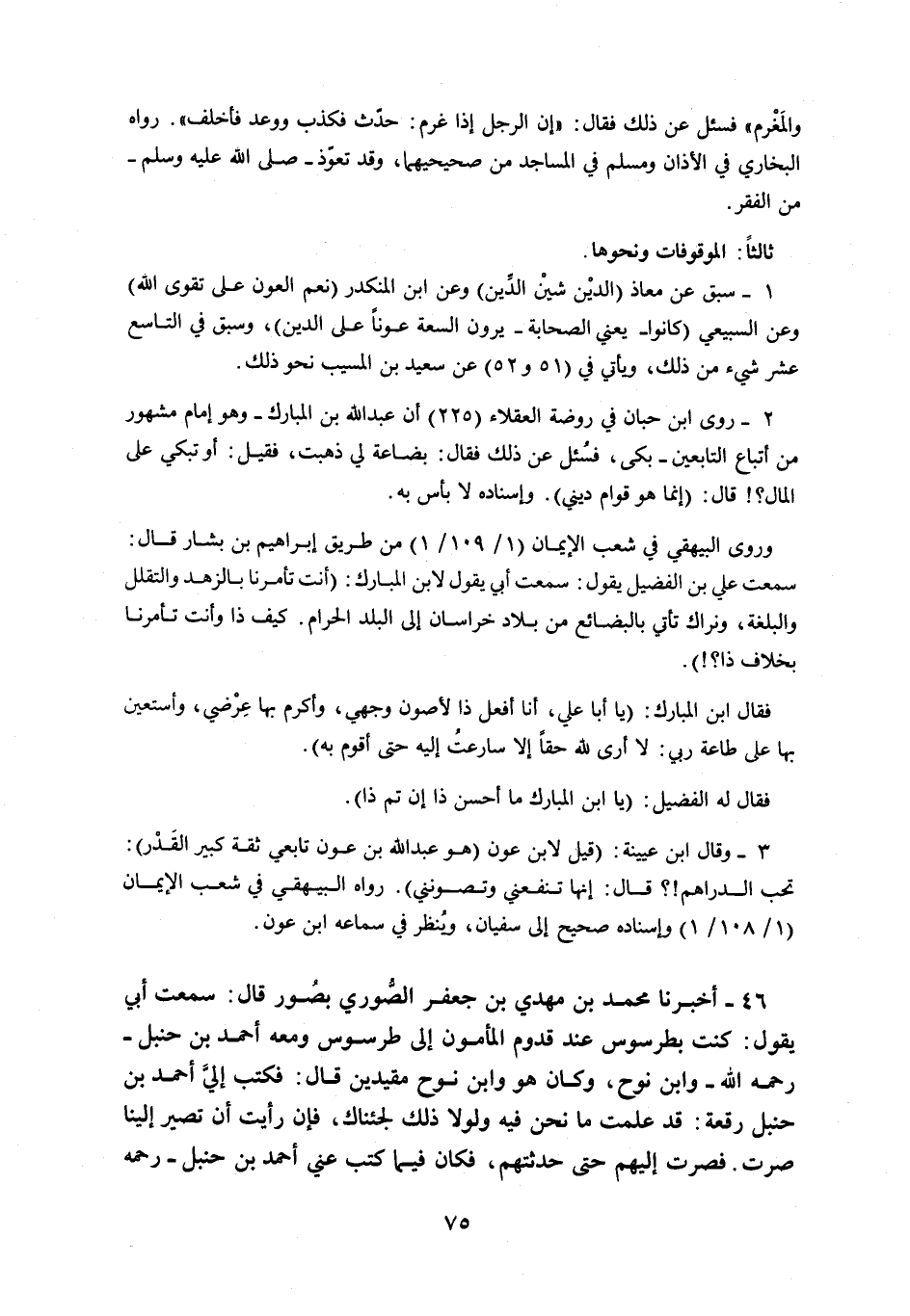45 - أَخْبَرَنَا مُحَمَّدُ بْنُ مَهْدِيِّ بْنِ جَعْفَرٍ الصُّورِيُّ، بِصُورَ، قَالَ سَمِعْتُ أَبِي يَقُولُ،: كُنْتُ بِطَرَسُوسَ عِنْدَ قُدُومِ الْمَأْمُونِ إِلَى طَرَسُوسَ، وَمَعَهُ أَحْمَدُ بْنُ حَنْبَلٍ رَحِمَهُ اللَّهُ وَابْنُ نُوحٍ، وَكَانَ هُوَ وَابْنُ نُوحٍ مُقَيَّدِينَ، قَالَ: فَكَتَبَ إِلَيَّ أَحْمَدُ بْنُ حَنْبَلٍ رُقْعَةً: قَدْ عَلِمْتَ مَا نَحْنُ فِيهِ، وَلَوْلَا ذَلِكَ لَجِئْنَاكَ، فَإِنْ رَأَيْتَ أَنْ تَصِيرَ إِلَيْنَا صِرْتَ، فَصِرْتُ إِلَيْهِمْ حَتَّى حَدَّثْتُهُمْ. فَكَانَ فِيمَا كَتَبَ عَنِّي أَحْمَدُ بْنُ حَنْبَلٍ رَحِمَهُ -[76]- اللَّهُ: ثنا ضَمْرَةُ، عَنْ رَجَاءِ بْنِ أَبِي سَلَمَةَ، عَنْ عَبْدِ رَبِّهِ بْنِ سُلَيْمَانَ بْنِ زُنْبُورٍ، عَنِ ابْنِ مُحَيْرِيزٍ، قَالَ: مَا مِنْ §طَعَامٍ أَمْلَأُ بِهِ مَا بَيْنَ جَنْبِي بَعْدَ سَعْيِي، يُعَدُّ فِيهِ بَيْنَ الْأَسْوَدِ وَالْأَحْمَرِ، أَحَبُّ إِلَيَّ مِنْ طَعَامِ تَاجِرٍ صَدُوقٍ