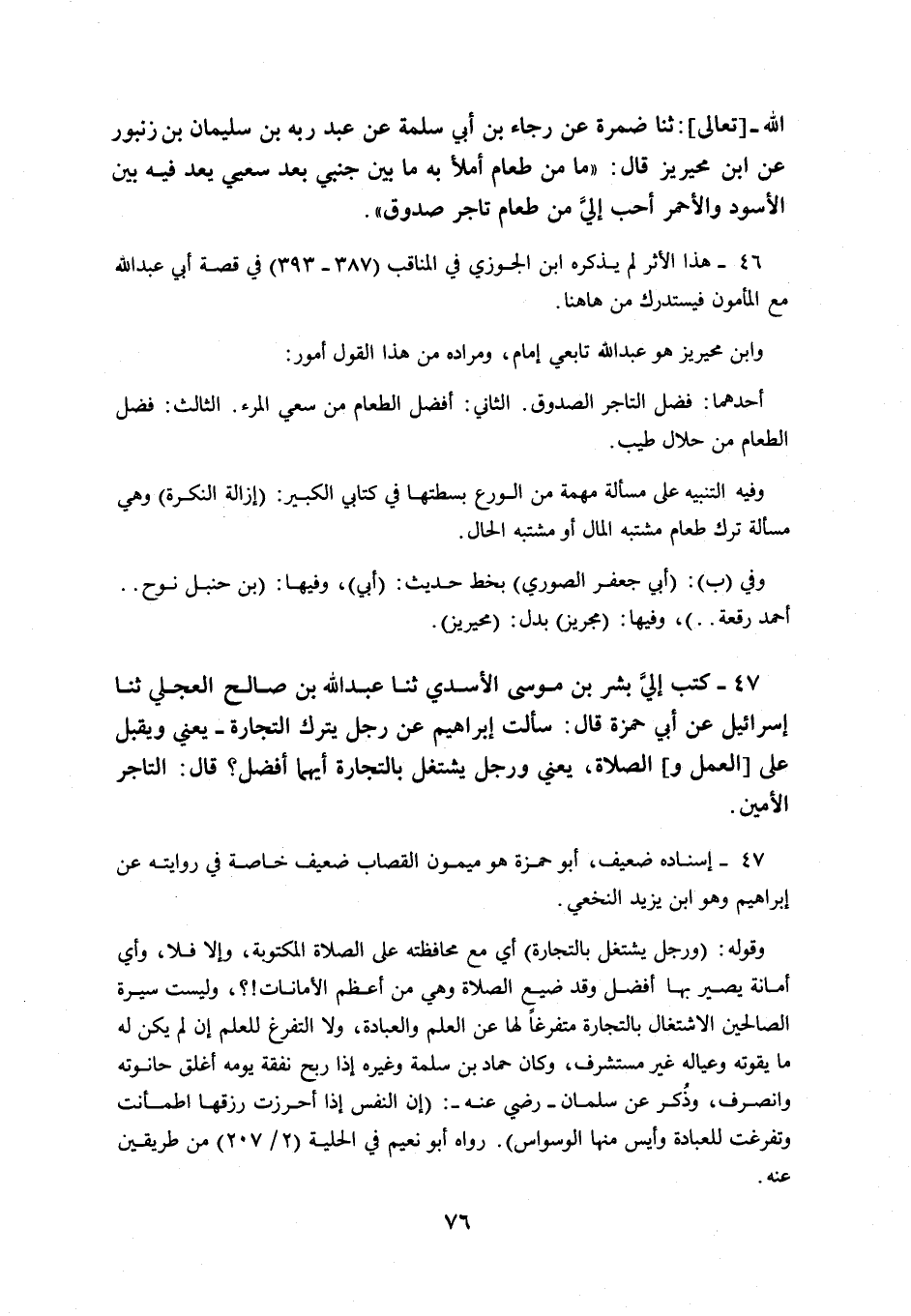 46 - كَتَبَ إِلَيَّ بِشْرُ بْنُ مُوسَى الْأَسَدِيُّ، ثنا عَبْدُ اللَّهِ بْنُ صَالِحٍ الْعِجْلِيُّ، ثنا إِسْرَائِيلُ، عَنْ أَبِي حَمْزَةَ، قَالَ: سَأَلْتُ إِبْرَاهِيمَ عَنْ §رَجُلٍ يَتْرُكُ التِّجَارَةَ، يَعْنِي وَيُقْبِلُ عَلَى الصَّلَاةِ، يَعْنِي: وَرَجُلٍ يَشْتَغِلُ بِالتِّجَارَةِ أَيُّهُمَا أَفْضَلُ؟ قَالَ: «التَّاجِرُ الْأَمِينُ»