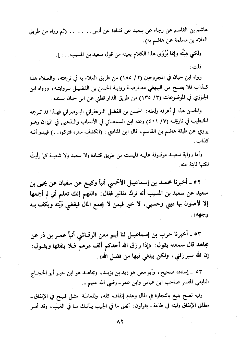 51 - أَخْبَرَنَا مُحَمَّدُ بْنُ إِسْمَاعِيلَ الْأَحْمَسِيُّ، أَنْبَأَ وَكِيعٌ، عَنْ سُفْيَانَ، عَنْ يَحْيَى بْنِ سَعِيدٍ، عَنْ سَعِيدِ بْنِ الْمُسَيِّبِ، أَنَّهُ §تَرَكَ دَنَانِيرَ، فَقَالَ: اللَّهُمَّ إِنَّكَ تَعْلَمُ أَنِّي لَمْ أَجْمَعْهَا إِلَّا لِأَصُونَ بِهَا دِينِي وَحَسَبِي، لَا خَيْرَ فِيمَنْ لَا يَجْمَعُ الْمَالَ فَيَقْضِيَ دَيْنَهُ، وَيَكُفُّ بِهِ وَجْهَهُ