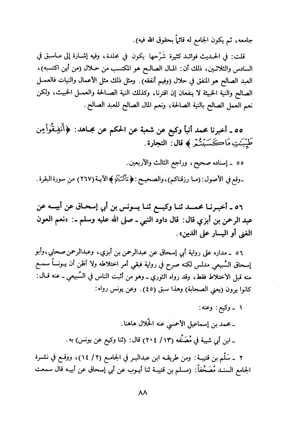 55 - أَخْبَرَنَا مُحَمَّدٌ، ثنا وَكِيعٌ، ثنا يُونُسُ بْنُ أَبِي إِسْحَاقَ، عَنْ أَبِيهِ، عَنْ عَبْدِ الرَّحْمَنِ بْنِ أَبْزَى، قَالَ: " قَالَ دَاوُدُ النَّبِيُّ صَلَّى اللهُ عَلَيْهِ وَسَلَّمَ: §نِعْمَ الْعَوْنُ الْغِنَى أَوِ الْيَسَارُ عَلَى الدِّينِ "