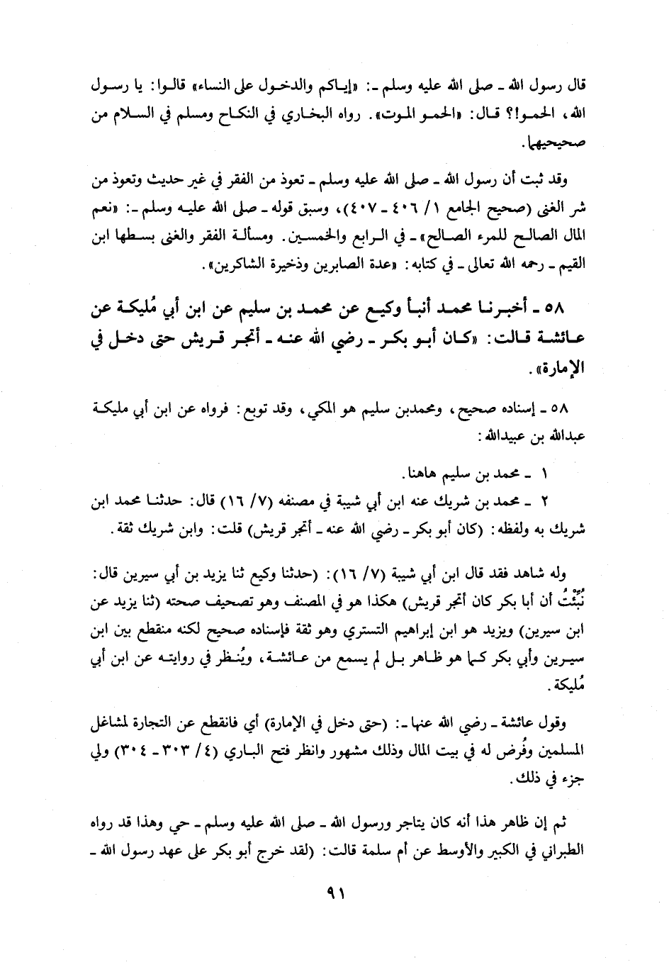 57 - أَخْبَرَنَا مُحَمَّدٌ، أَنْبَأَ وَكِيعٌ، عَنْ مُحَمَّدِ بْنِ سُلَيْمٍ، عَنِ ابْنِ أَبِي مُلَيْكَةَ، عَنْ عَائِشَةَ، قَالَتْ: كَانَ §أَبُو بَكْرٍ رَضِيَ اللَّهُ عَنْهُ أَتْجَرَ قُرَيْشٍ حَتَّى دَخَلَ فِي الْإِمَارَةِ